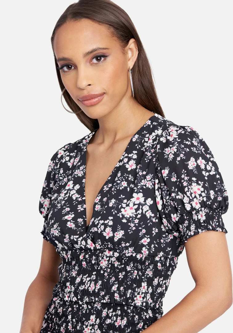 This Bebe Crepe Deep V Print Top is perfect for summer strolls or brunch with the girls. It features a v-neckline and fitted short hem.