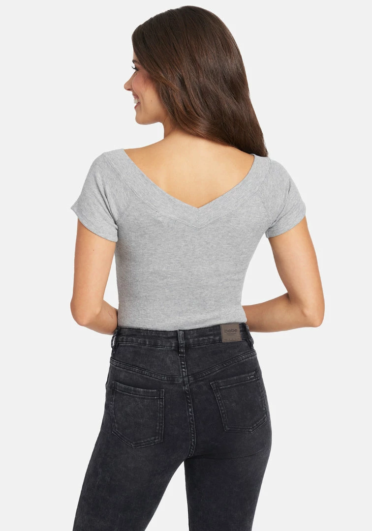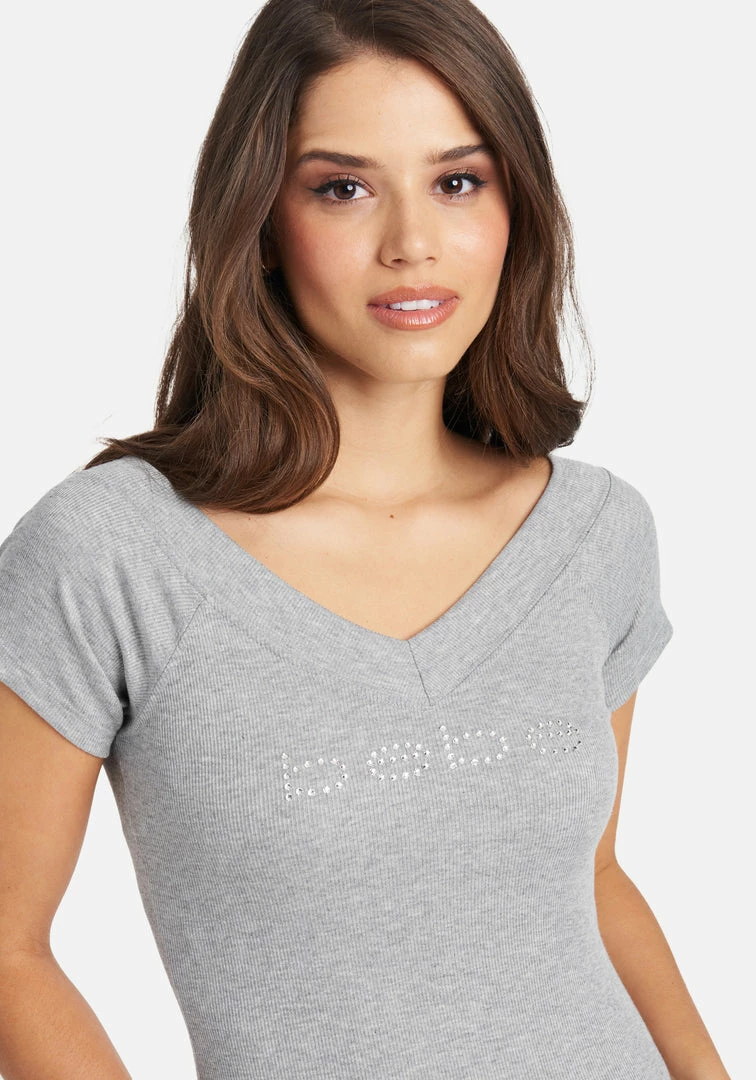 A knit tee with our essential BEBE logo in the classic jewels. Features a double V-neckline and short sleeves.