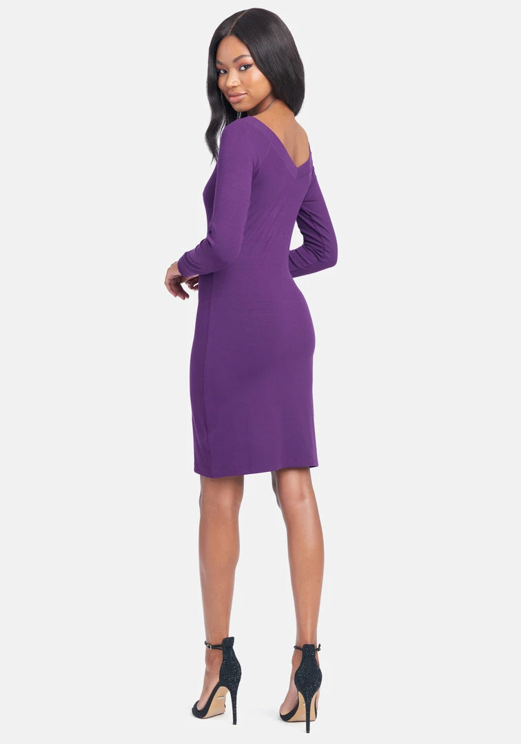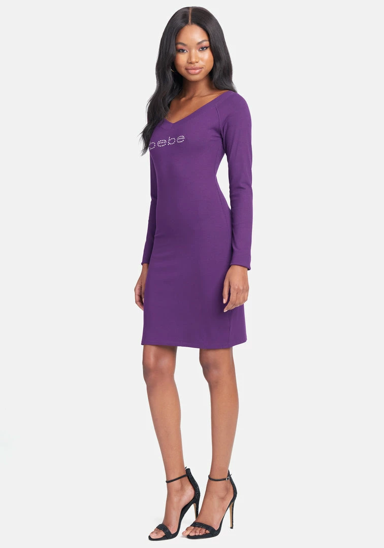 This fitted V-neck dress fits like a glove and flaunts a sparkly Bebe logo for an elevated look.