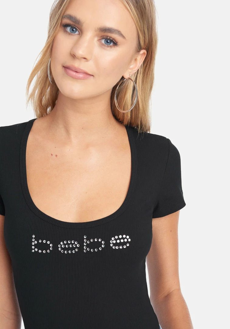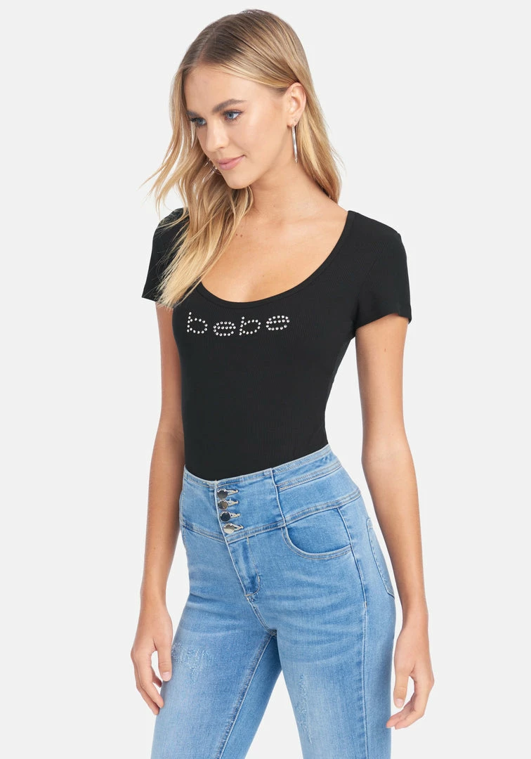 Add a sexy sparkle to your wardrobe. A bebe logo sparkles from the front of this cute scoop neck tee.