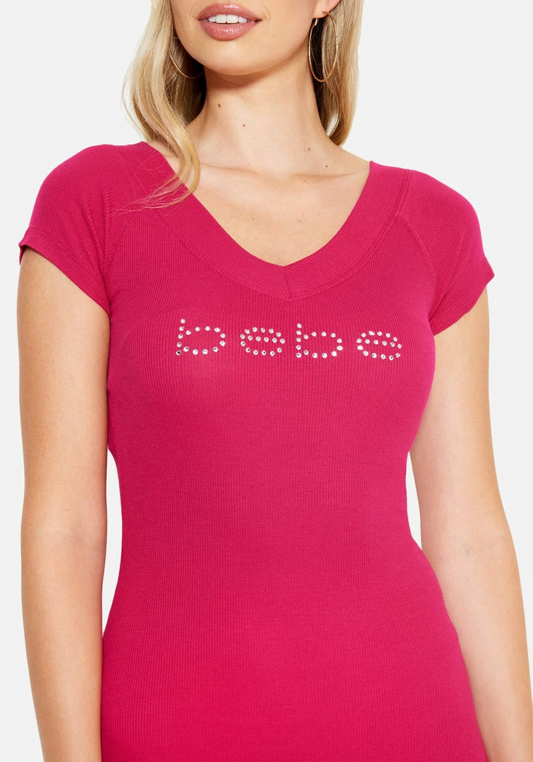 Our classic logo in timeless jewels, this knit shirt dress has a bodycon fit and a sexy V-neckline.