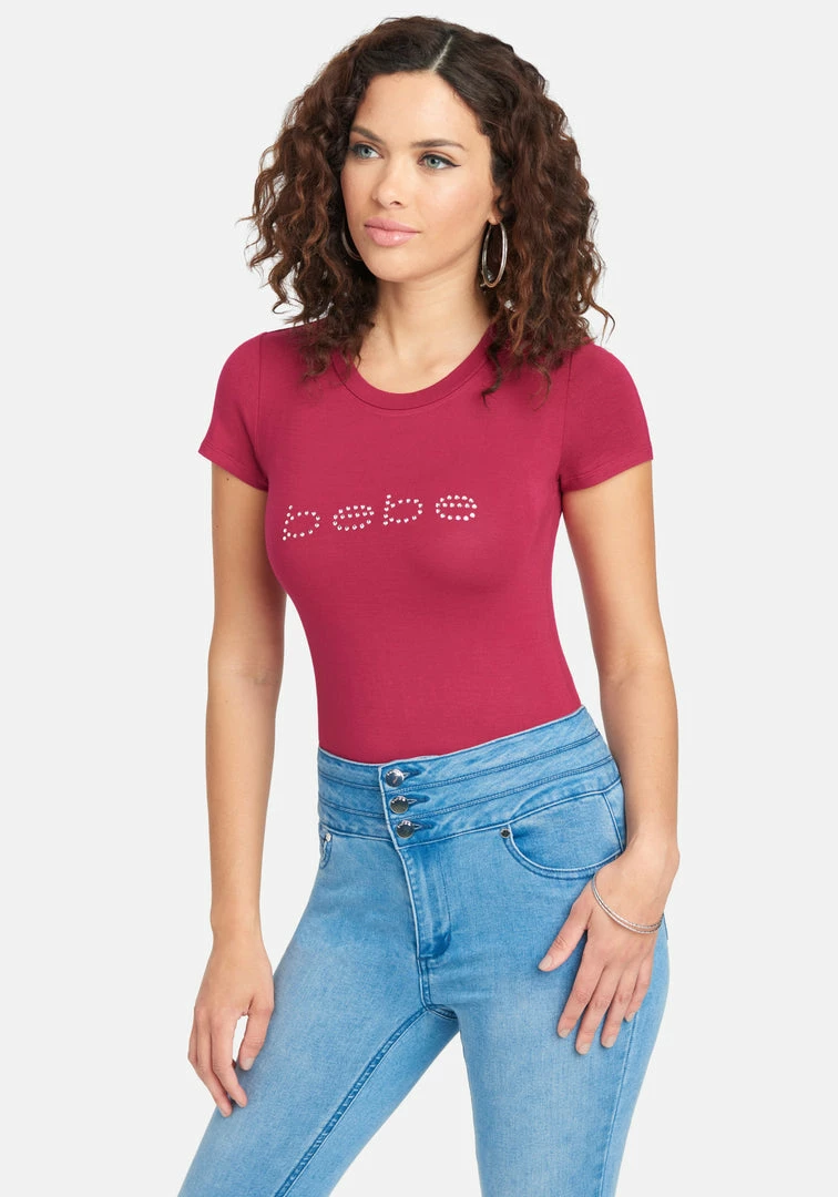 A bebe logo set in crystals sparkles from the front of this cute scoop neck tee. Comes in a chic silky jersey.