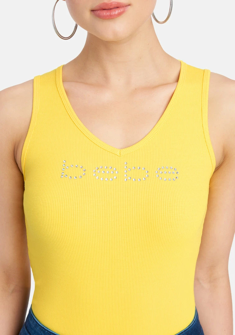 The iconic Bebe logo on a classic and sexy V-neck tank.