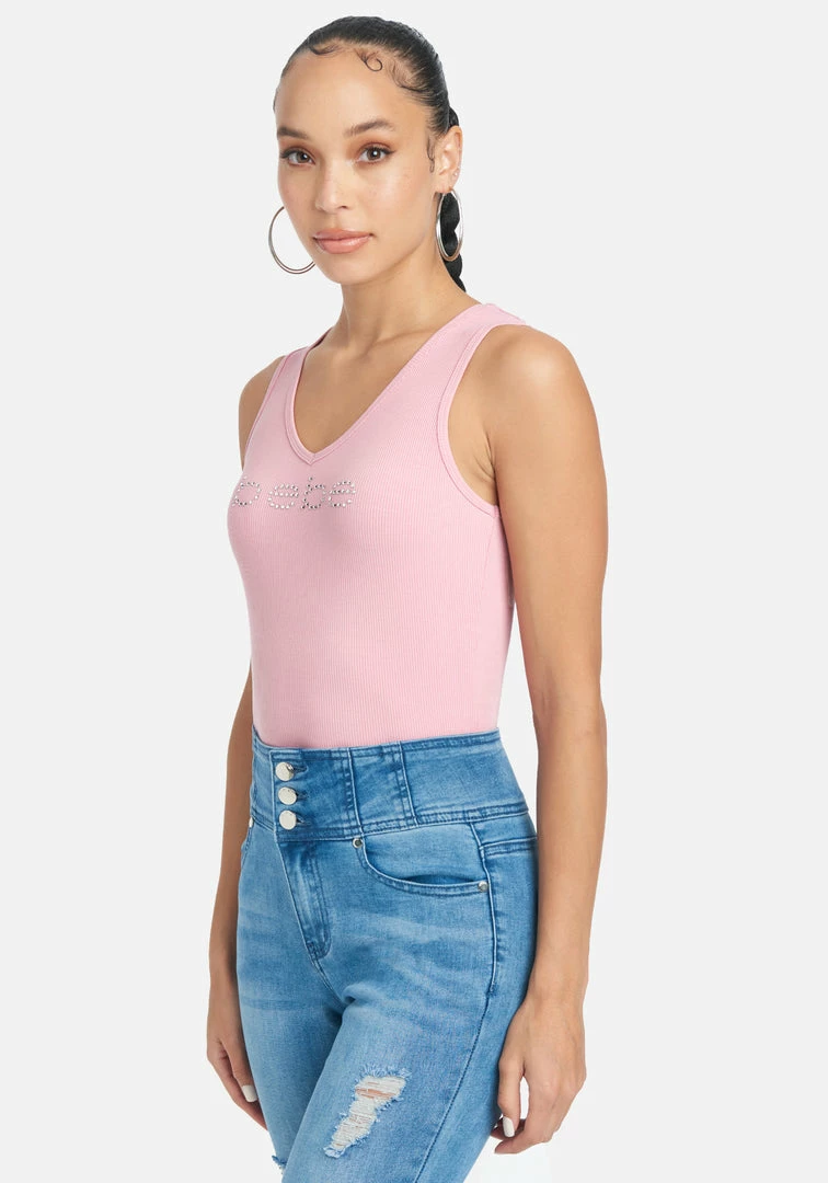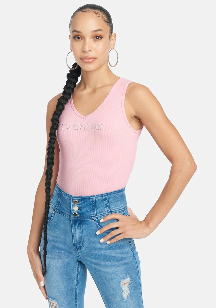 The iconic Bebe logo on a classic and sexy V-neck tank.