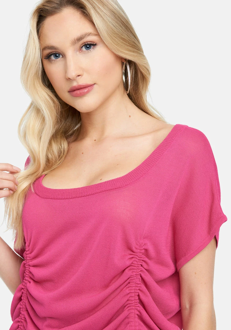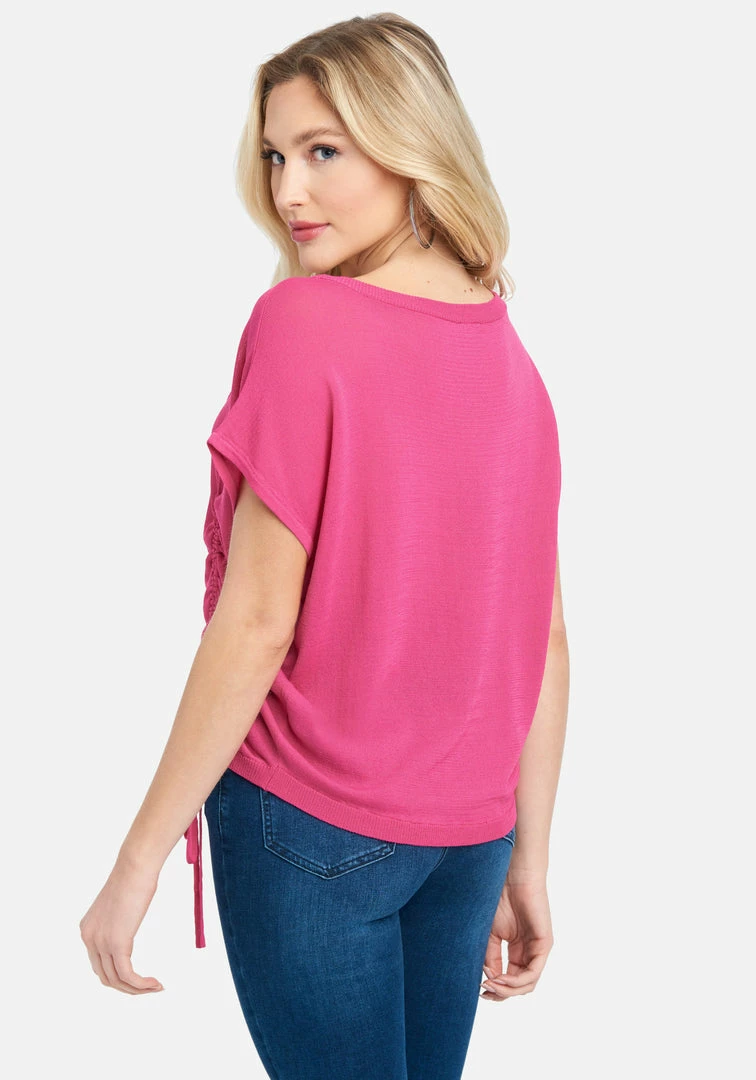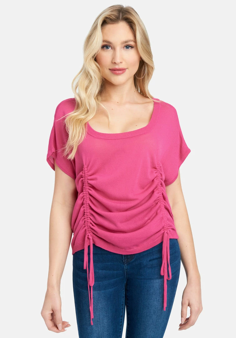 Chic and effortless, the Double Draw String sweater knit top is all you need to achieve a cute look every time. It features a low scoop neckline with drop shoulder sleeves and two cinch drawstring ties for an adjustable fit.