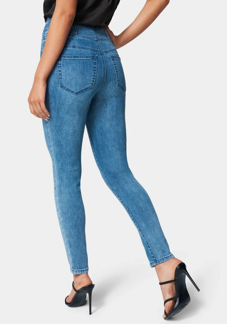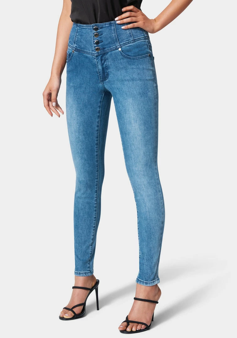 You’ve never worn jeans this flattering. These Skinny Leg Jeans are designed with a high button-fly corset waist and they pair perfectly with bodysuits and crop tops.