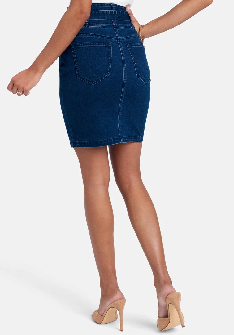 Polished gold-tone hardware meets a sleek denim pencil skirt for an updated casual look, finished with front and back pockets.