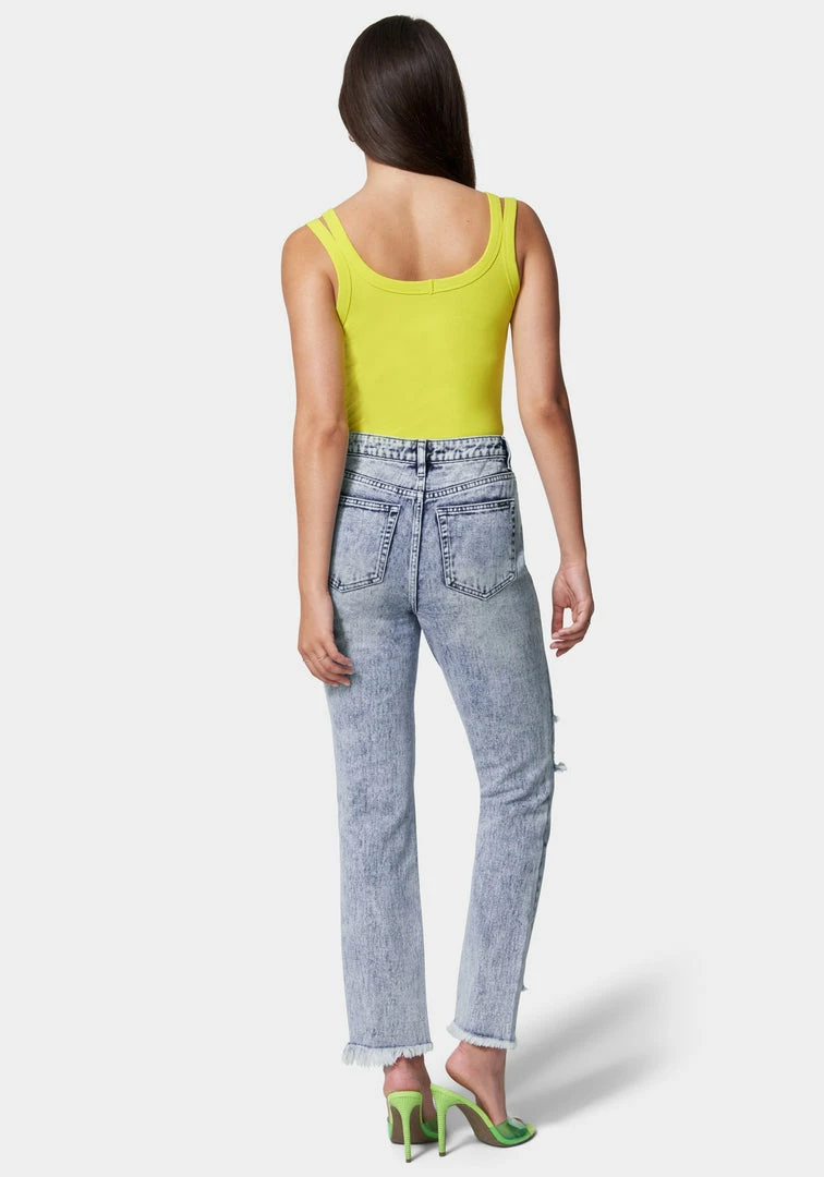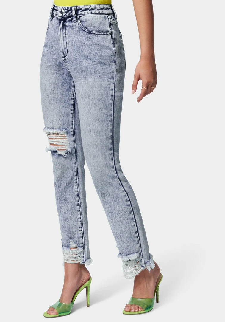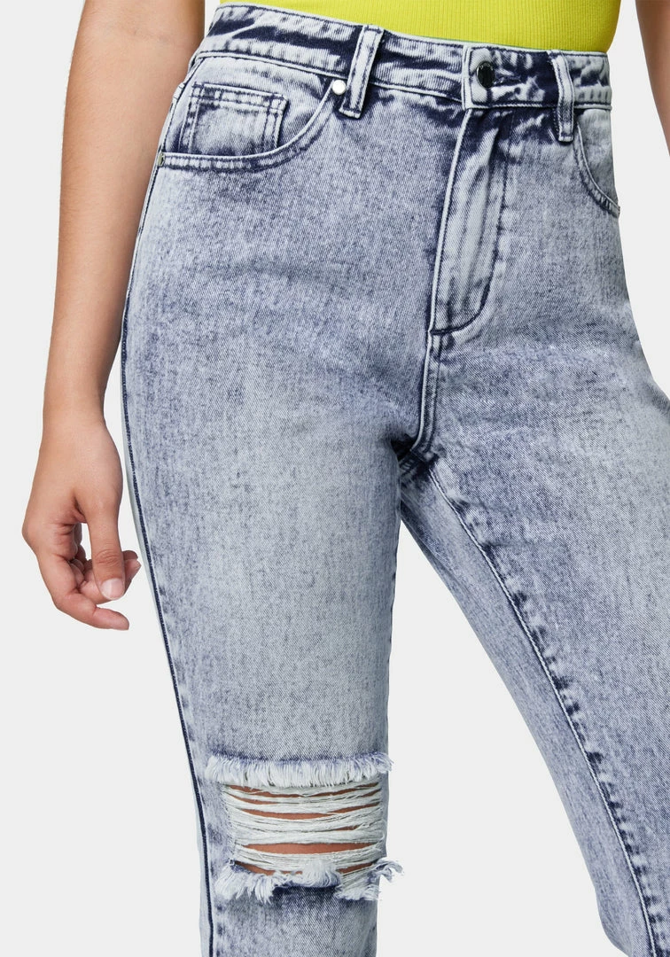 Our High Waist Straight Leg Denim now in an acid washed, distressed style. Features a full-length silhouette, lightly ripped details, frayed hems, five pocket construction and a zipper fly closure.