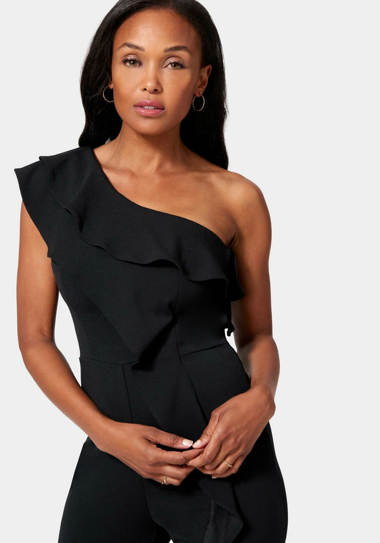 Bring the drama. You’ll turn heads in this one-shoulder jumpsuit featuring an allover crepe knit, cascade ruffle design, and wide-leg silhouette with a front leg slit.