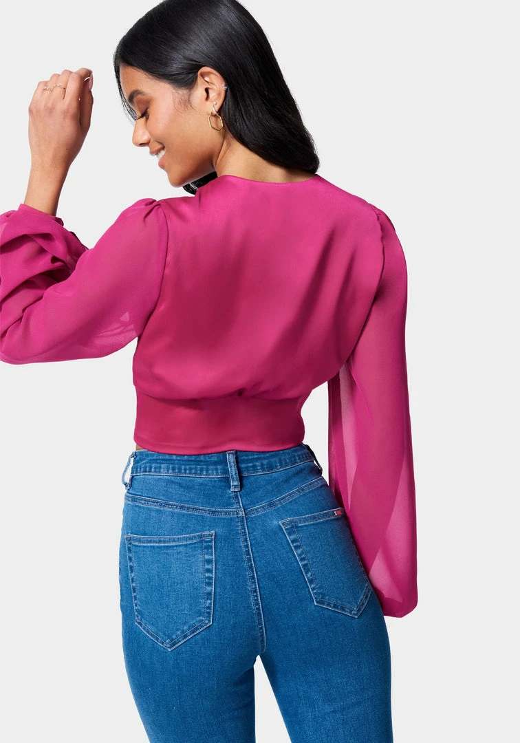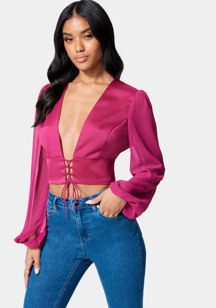 Sweet and romantic, this chiffon top features a lace-up plunging front, cropped silhouette, and is finished with long puff sleeves. Pair with your favorite denim or shorts for an easygoing spring look.