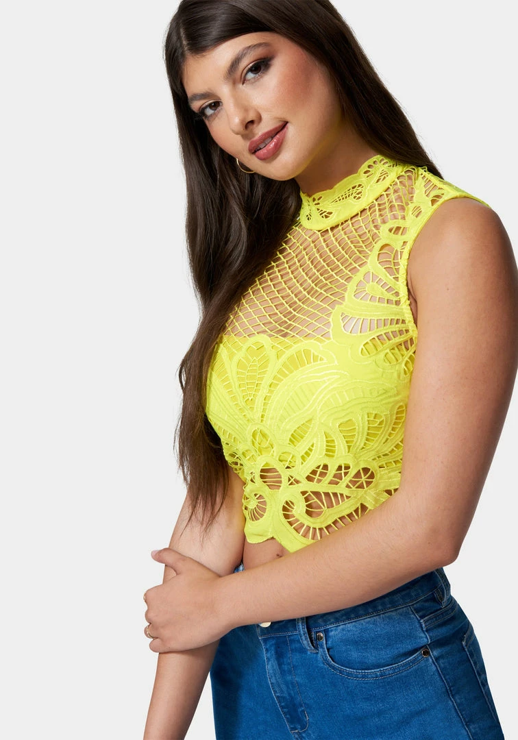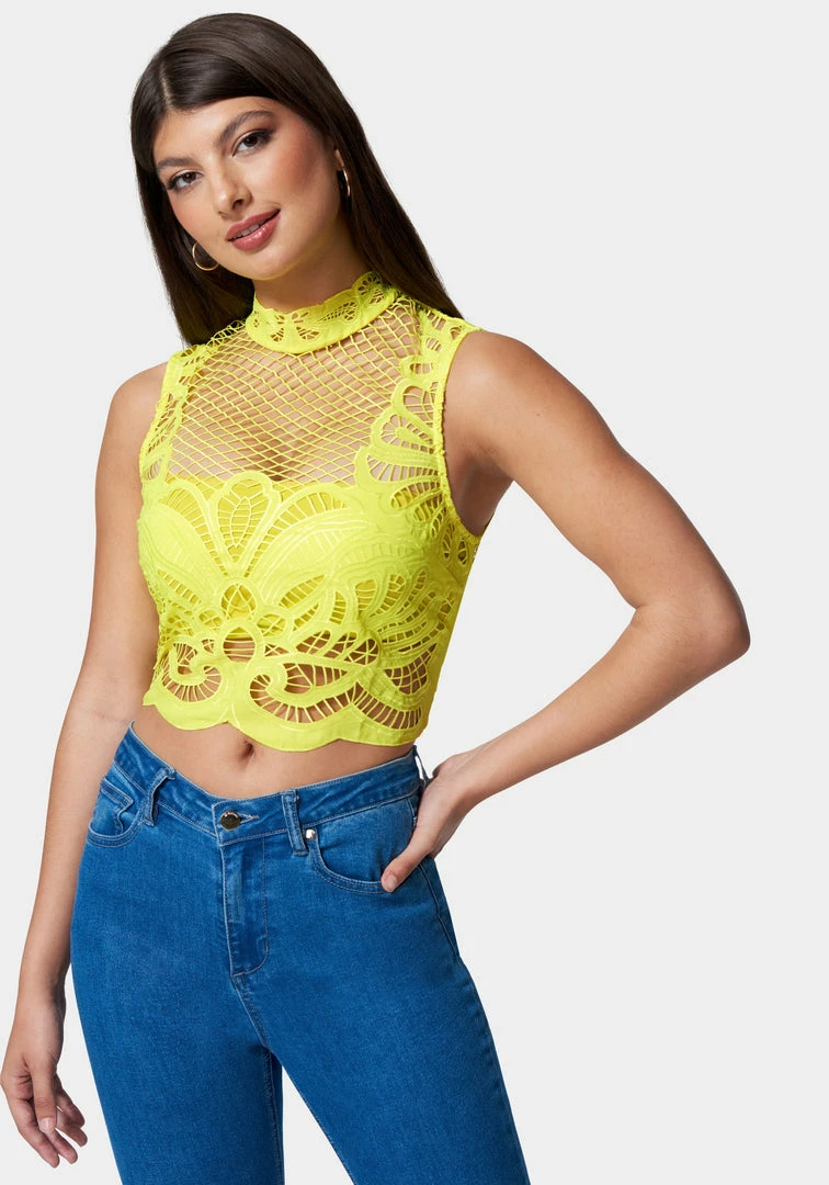 Sheer beauty. This is a sleeveless, open mesh knit top with lace appliques, a mock neck, scalloped trim, and an exposed zipper in the back.