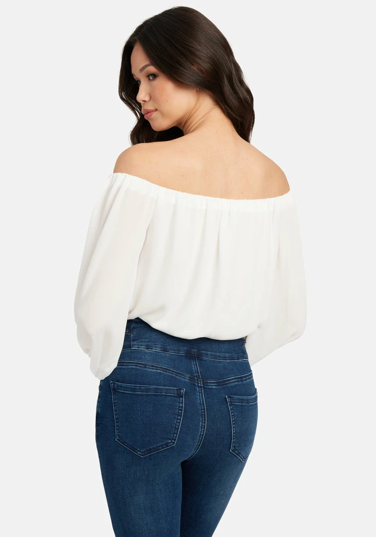 This dreamy Off Shoulder Crepe Bodysuit is a wardrobe staple. Features front button detailing for an added romantic element that can easily be dressed up or down.