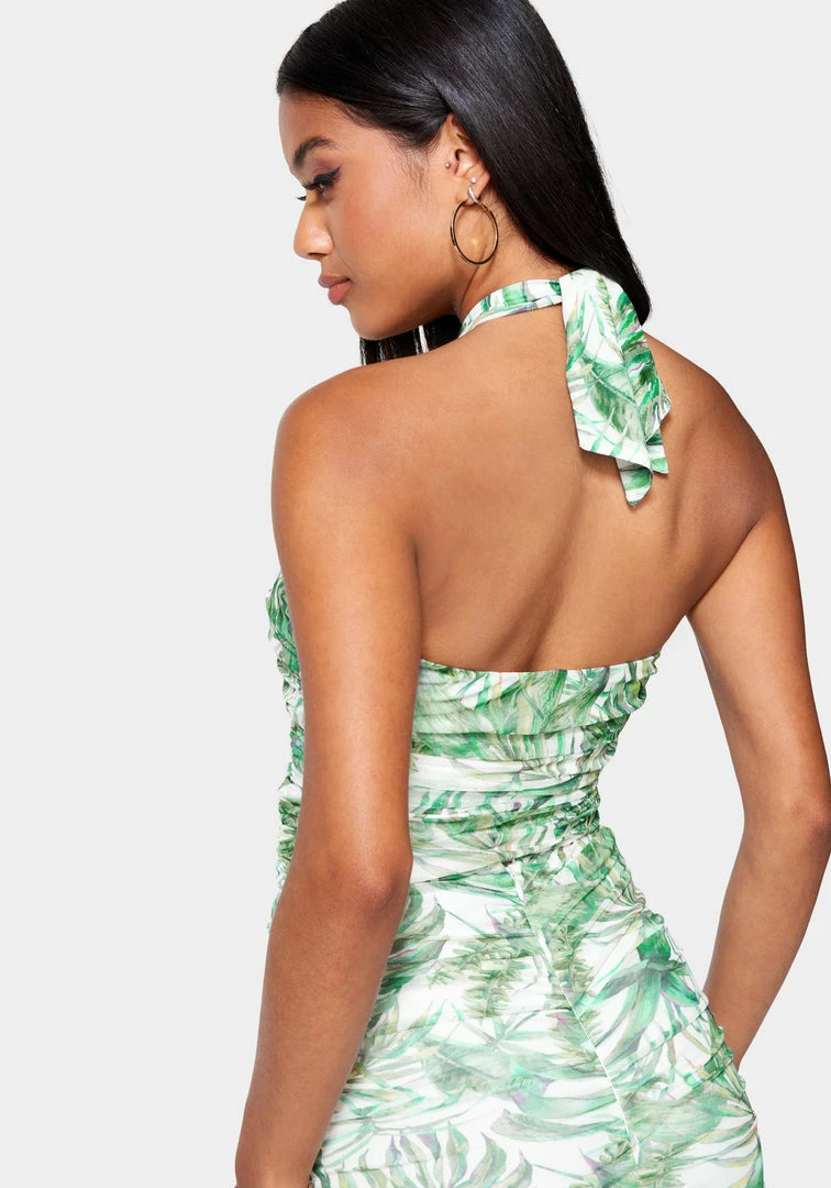 Look good in the heat. This mesh halter top features an all-over tropical print, ruching throughout, and a self-tie back. Pair with the Printed Mesh Ruched Wrap Skirt for a matching look.