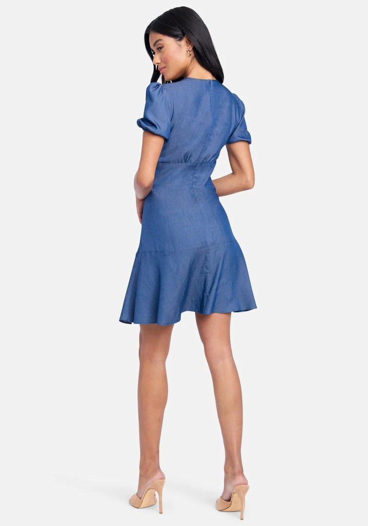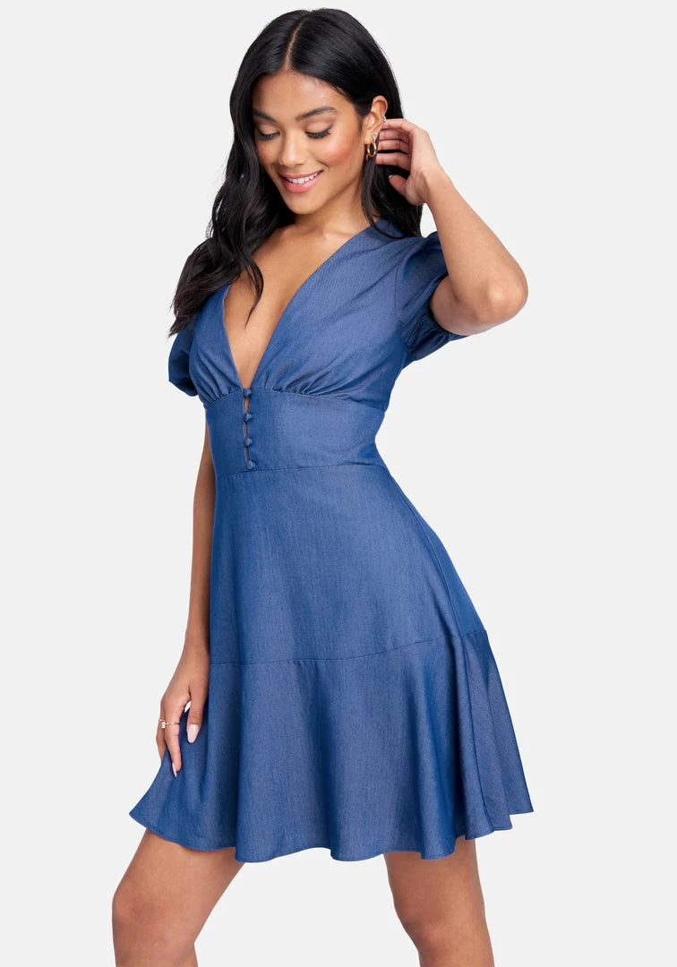 Looks like real denim but fits just like your favorite mini. A must-have this season, this fit-and-flare dress features puff sleeves and a deep V-neckline for a sweet yet sexy silhouette.