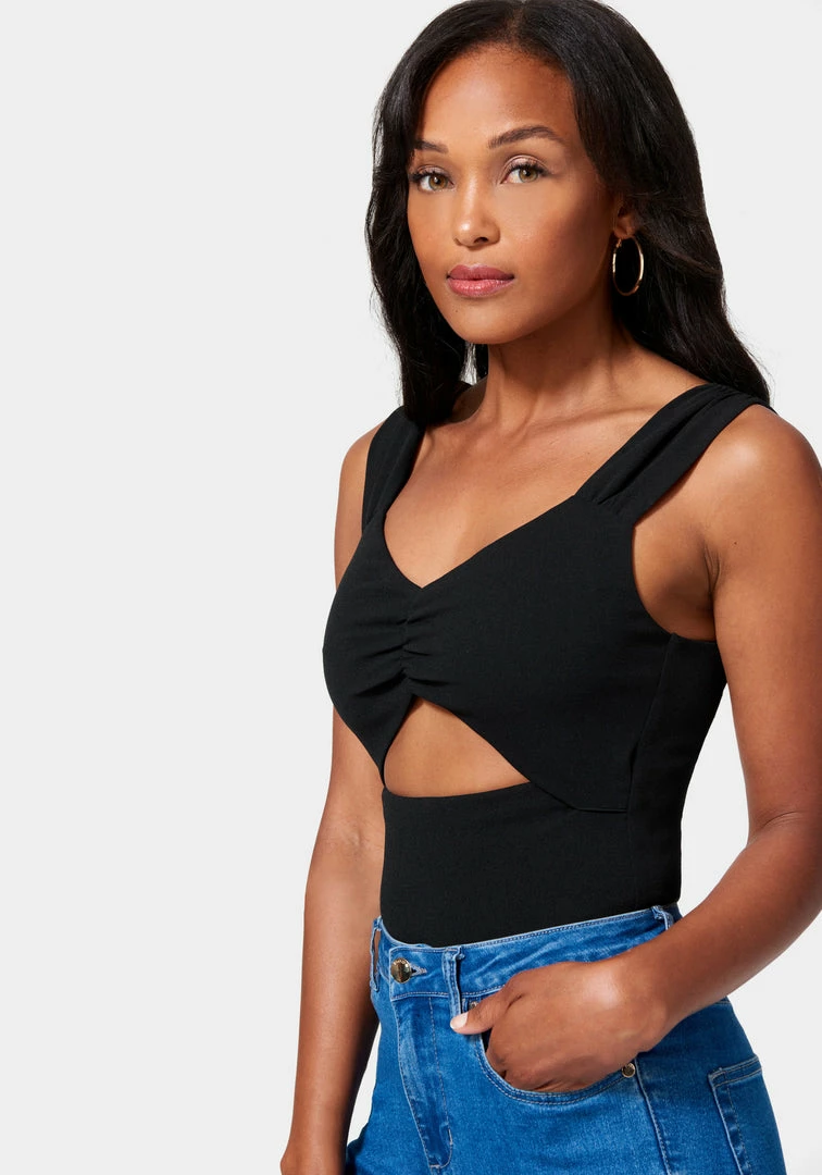 Create a sleek foundation with this Ruched Wide Strap Cutout Detail Top. This warm-weather-ready style features a back zip and a flattering silhouette.