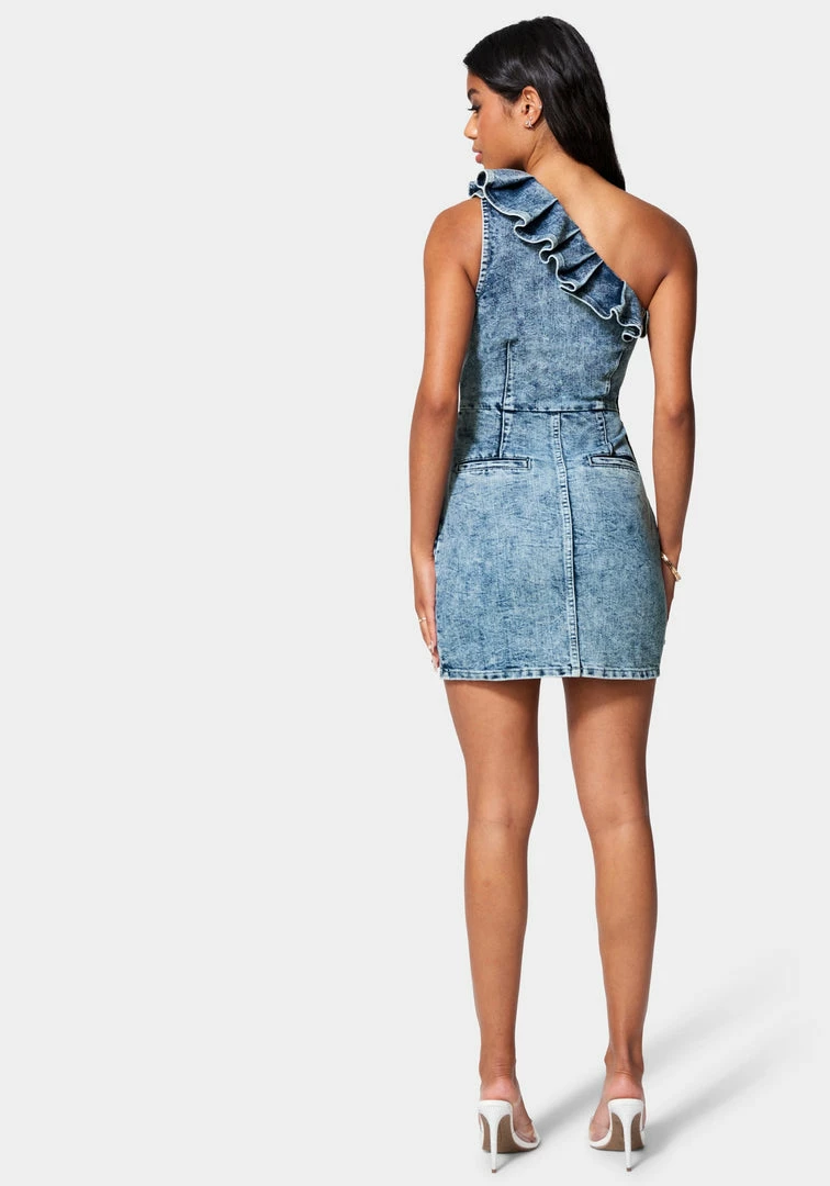 Designed to be figure-flattering, washed lurex denim mini dress features a ruffled one-shoulder design, seam-stitching throughout, and front slip pockets.