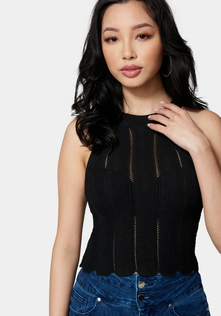 Soft and sweet. This is a pointelle knit halter top featuring a scalloped hem, high neckline, and cropped silhouette. Wear it with dark wash jeans or your favorite leather bottoms for some added edge to your look.
