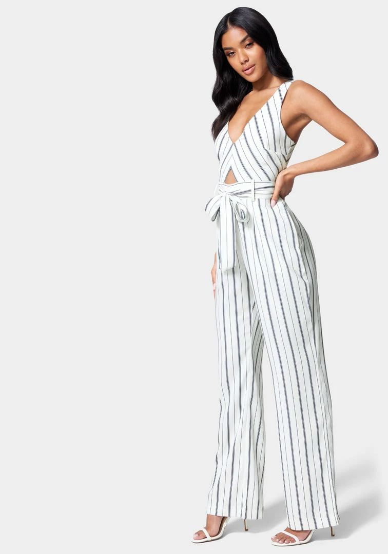 Suit up for spring. Designed to feel effortless, this sleeveless jumpsuit features an allover stripe design, front cutout, and wide-leg silhouette for the perfect breezy silhouette.