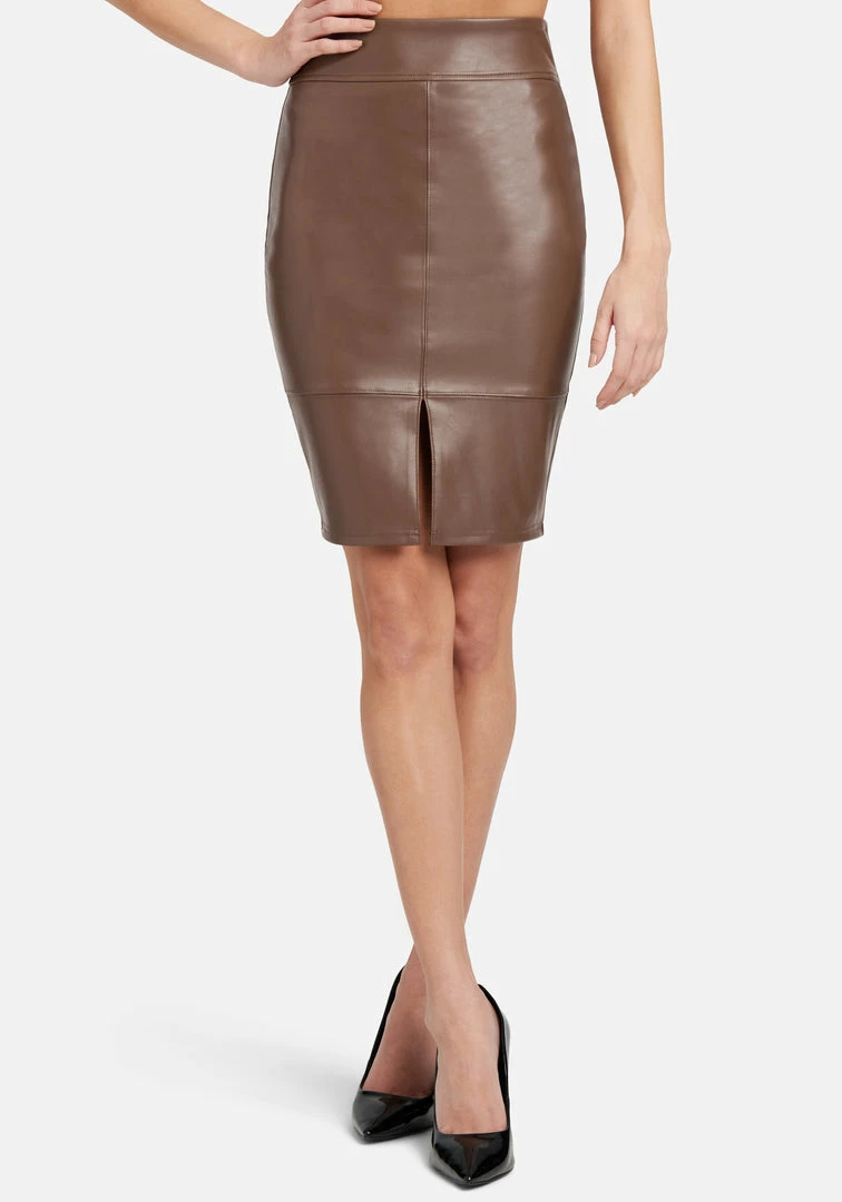 Just as soft as the real deal, this Vegan Leather Pencil Skirt features a modest front slit and the perfect figure-flattering fit.