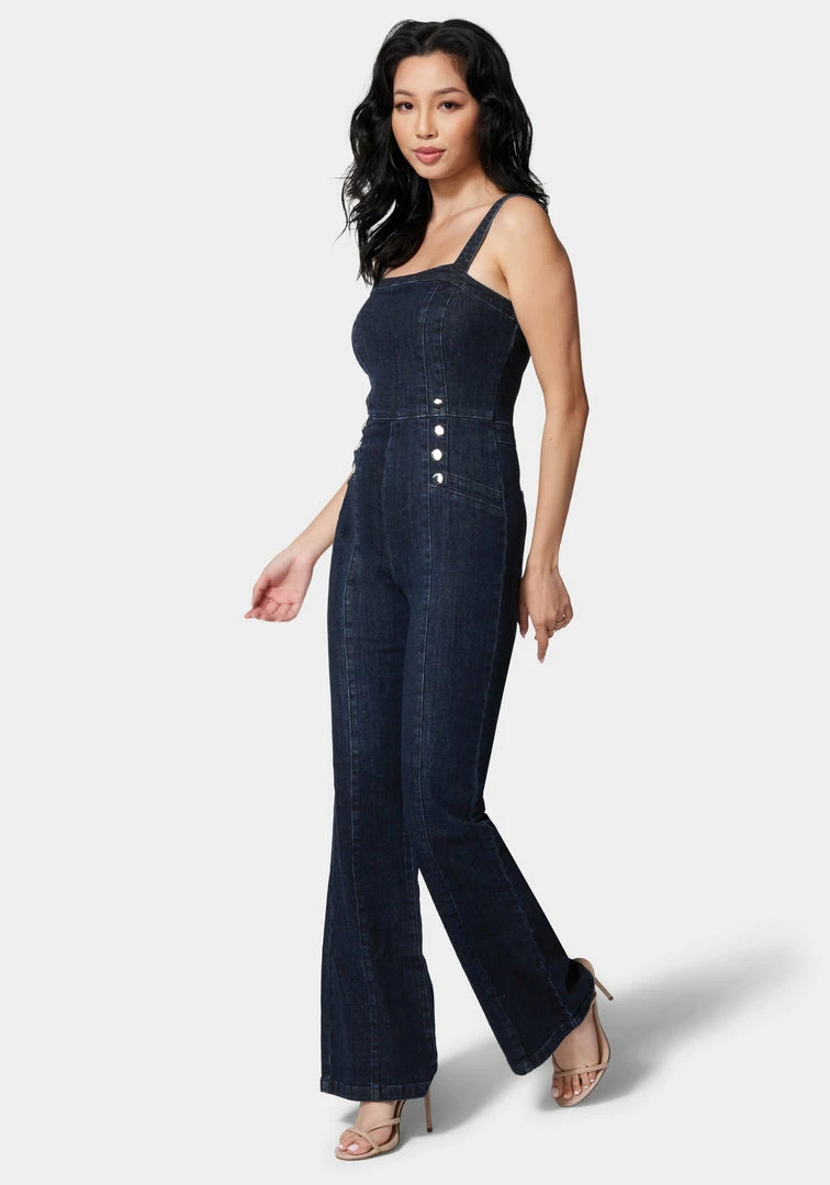 Suit yourself. Designed in stretch denim, this sleeveless jumpsuit features a form-fitting silhouette with a wide-leg cut for some drama. Finished with button detailing, seam-stitched panels, exposed back zipper, and back slip pockets.