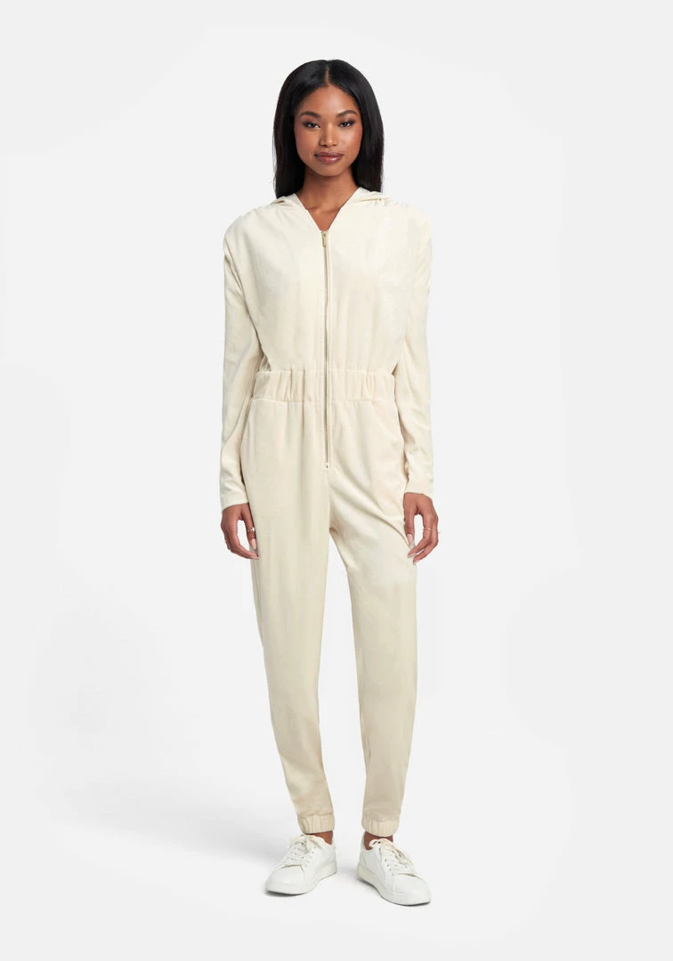 Where comfort meets luxe. This is a relaxed fit, long sleeve velour jumpsuit featuring a hooded style, exposed zipper front, front slip pockets, and cuffed hems. Pair with your favorite sneakers or chunky boots for an elevated lounge look.