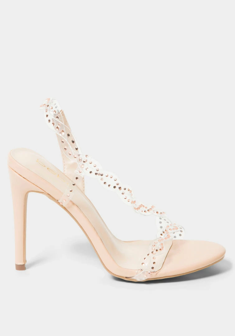 This Y2K-inspired strappy sandal features a clear strap design studded with rhinestones, a stiletto heel, and a faux leather sole for a sleek finish.