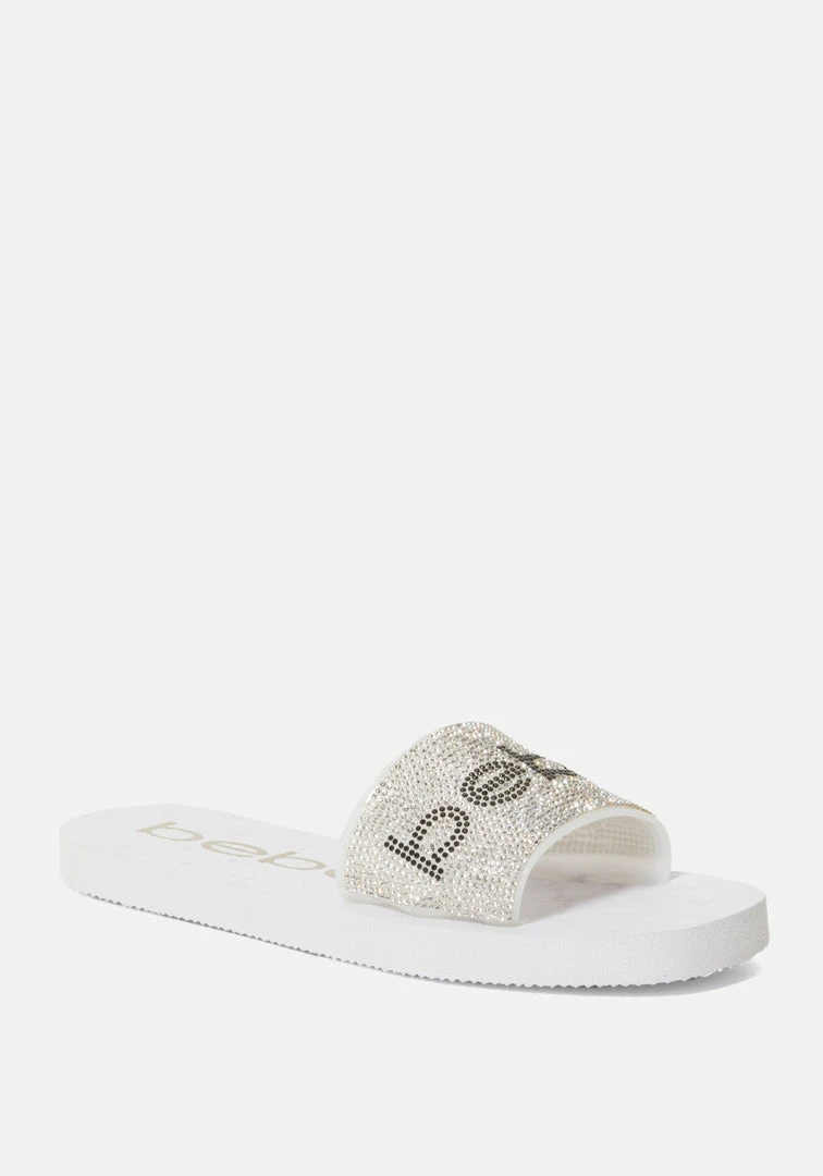 This playful slide sandal features a rhinestone-detailed vamp strap with the Bebe logo.
