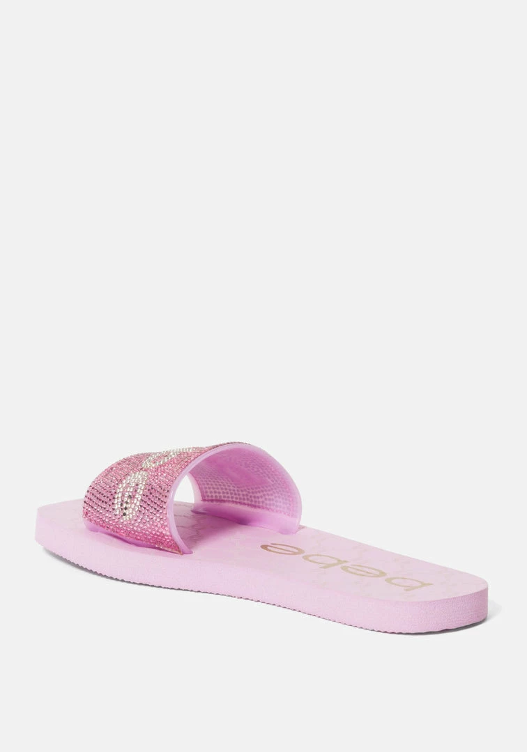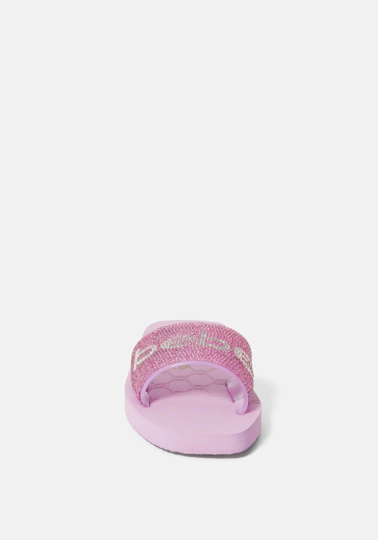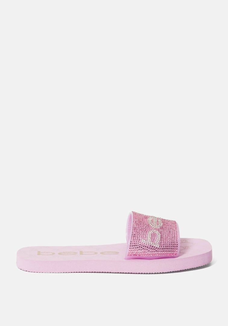 This playful slide sandal features a rhinestone-detailed vamp strap with the Bebe logo.