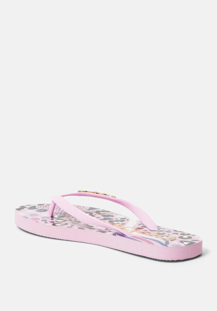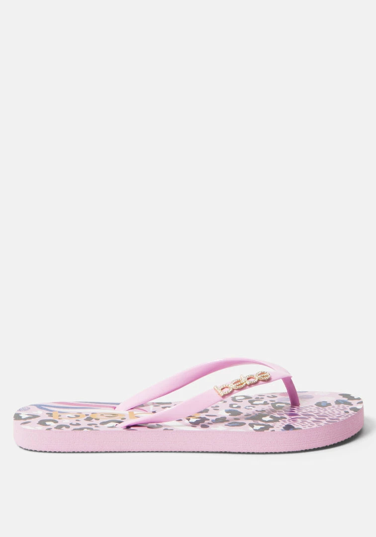 Add some style to your sunny day look with these chic flip-flops. Accented with a sparkly Bebe logo.