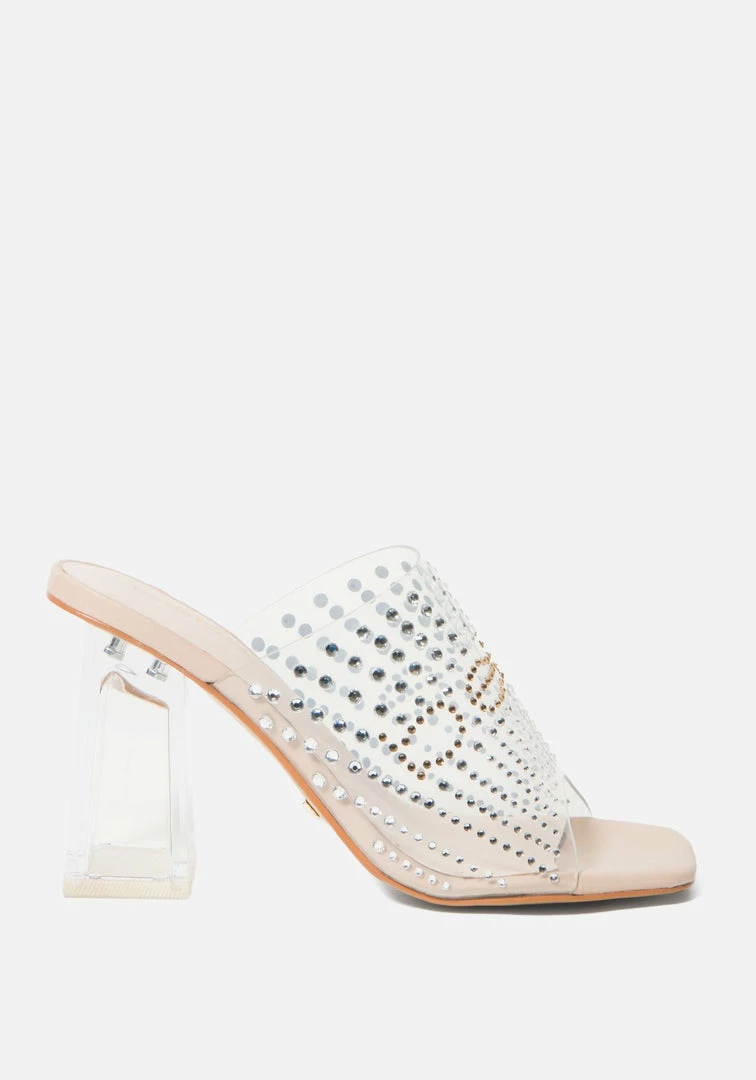 The future’s so bright – you’ll need this heel to match. This slip-on sandal style features a transparent strap bedazzled with jewels and a Bebe logo. A lucite heel adds a modern edge to this eye-catching style.