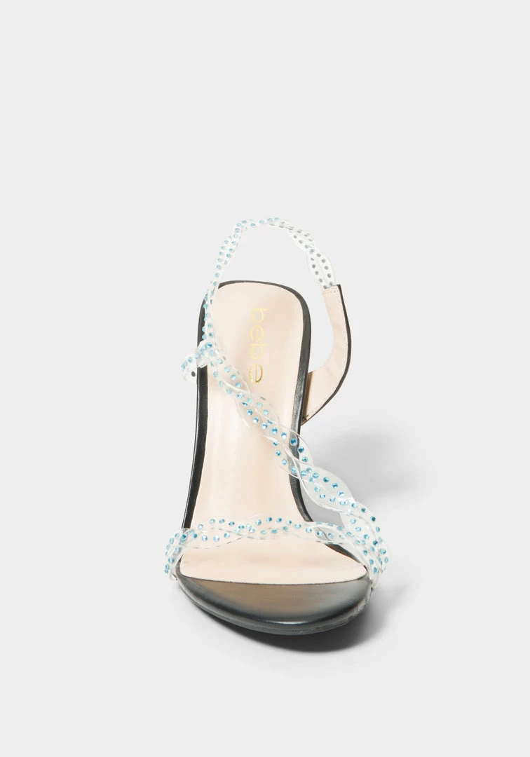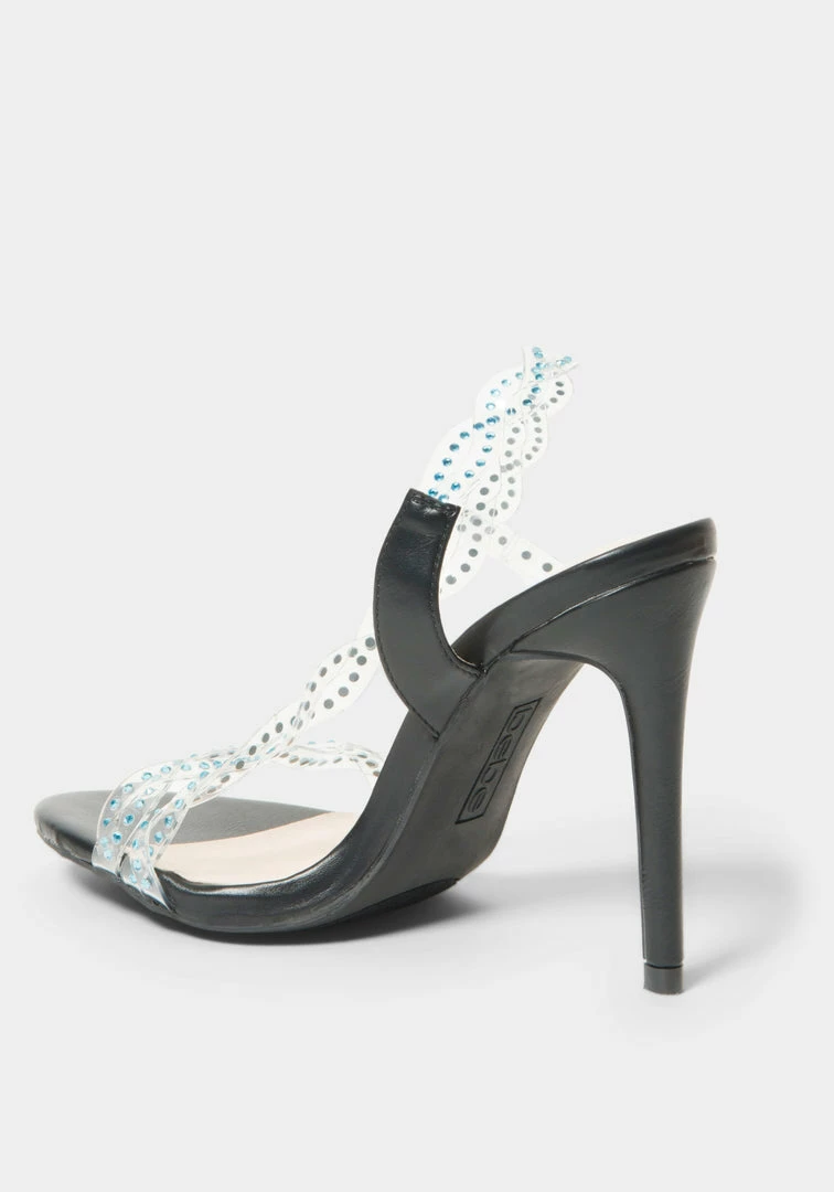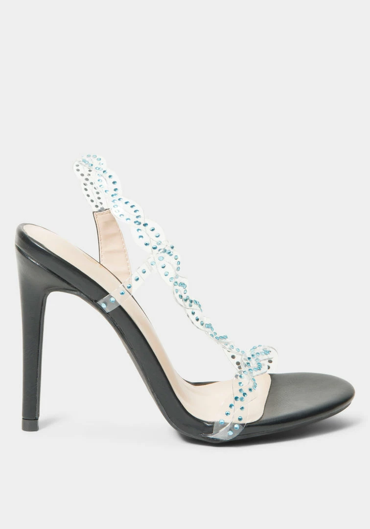 This Y2K-inspired strappy sandal features a clear strap design studded with rhinestones, a stiletto heel, and a faux leather sole for a sleek finish.