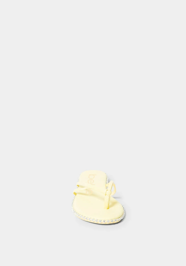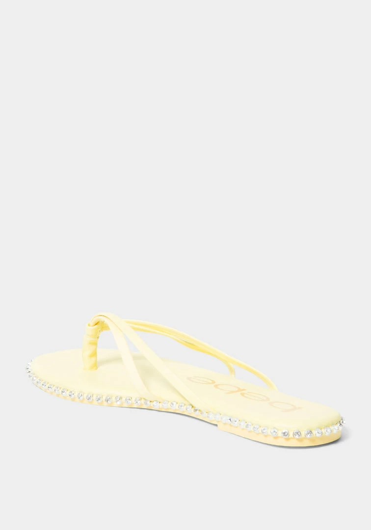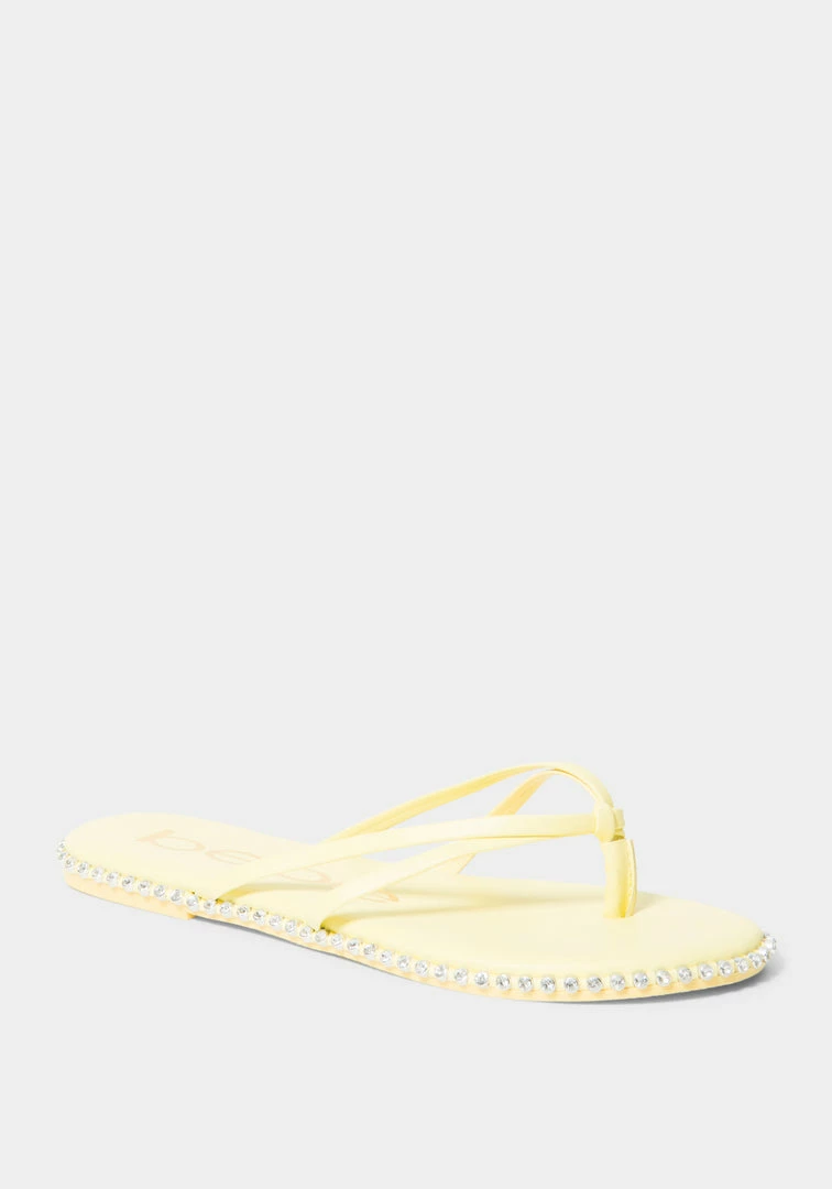 A low thong sandal features a studded design along the sole for a glamorous touch.