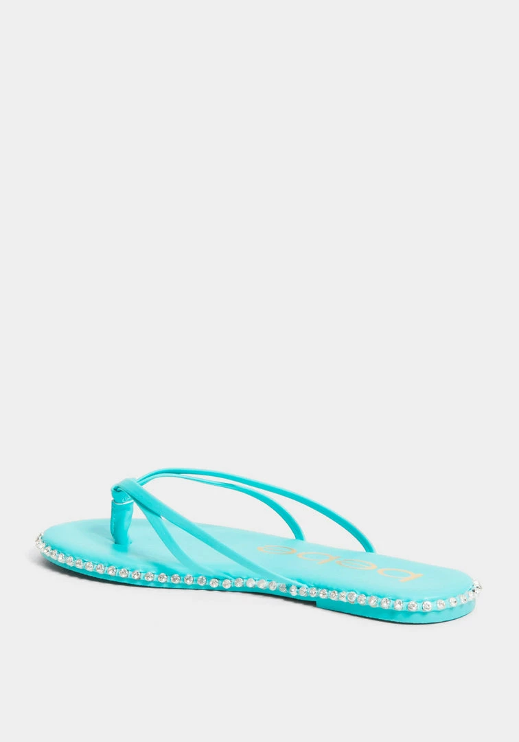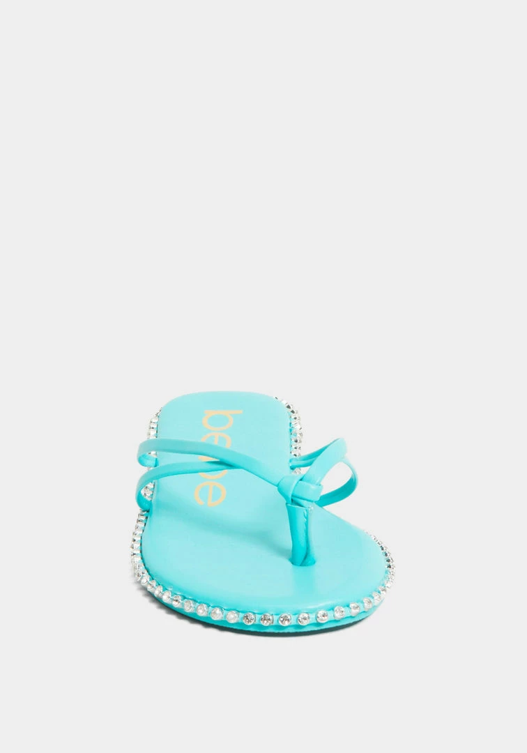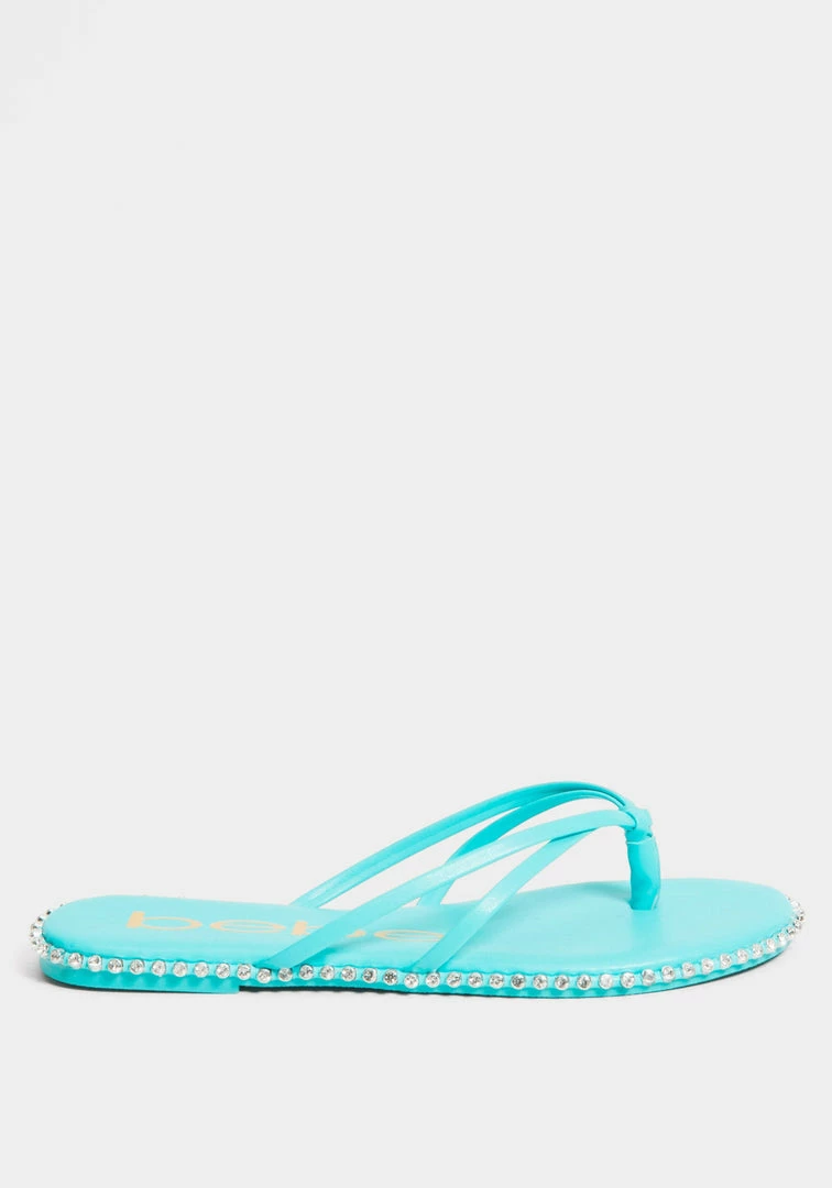 A low thong sandal features a studded design along the sole for a glamorous touch.