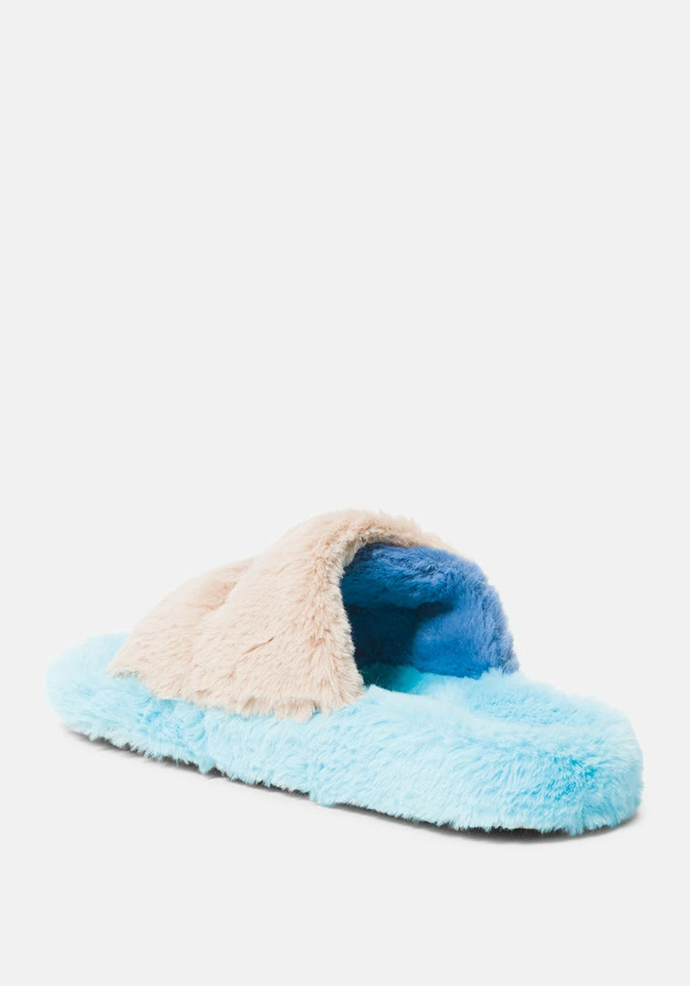 Lounge in style in these faux-fur slippers that feature two chunky straps running parallel across the foot.