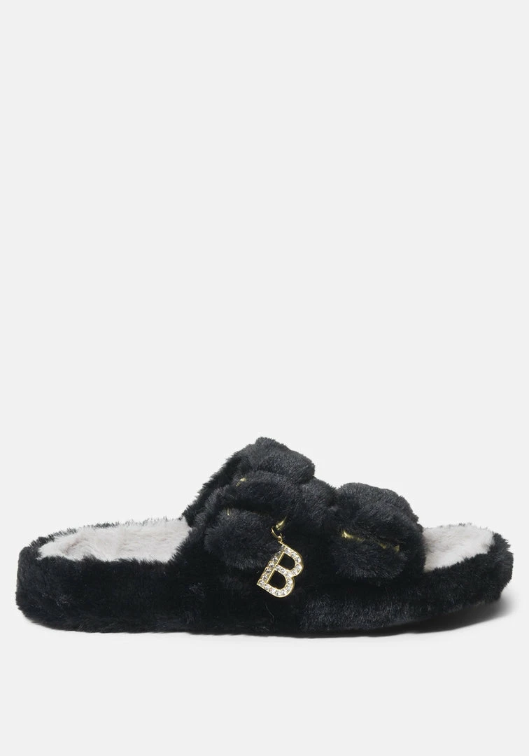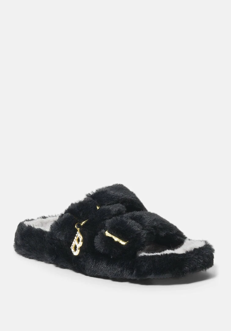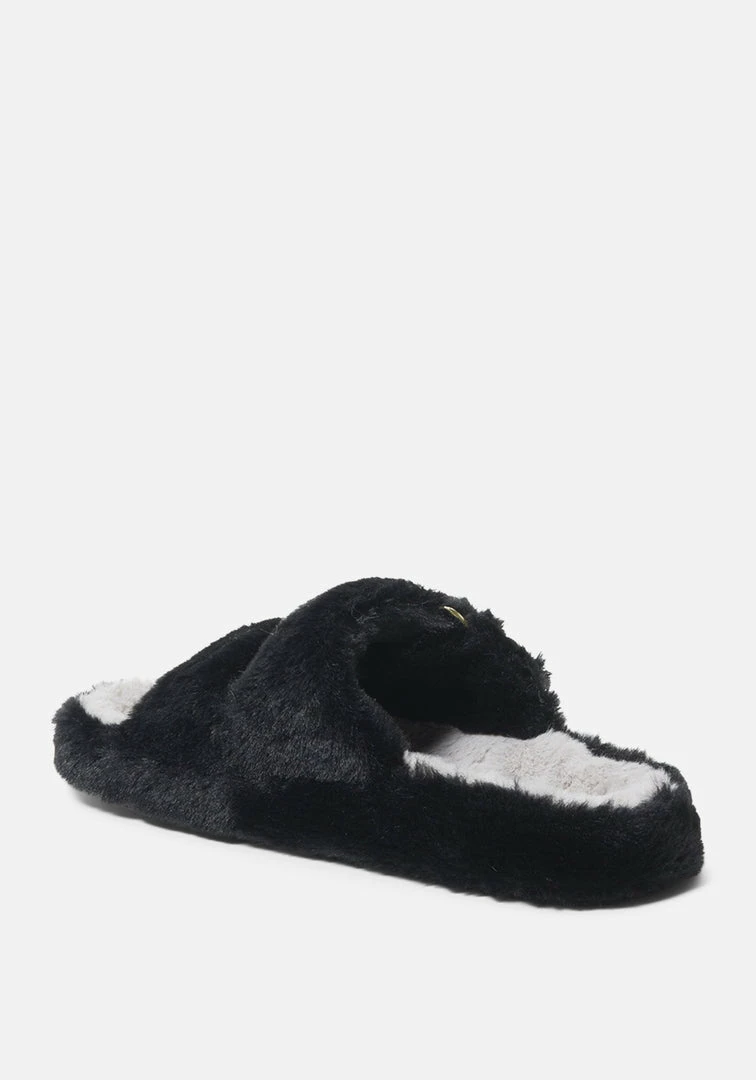 Lounge in style in these faux-fur slippers that feature two chunky straps running parallel across the foot.