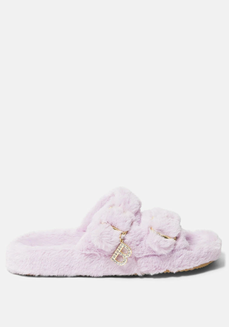 Lounge in style in these faux-fur slippers that feature two chunky straps running parallel across the foot.