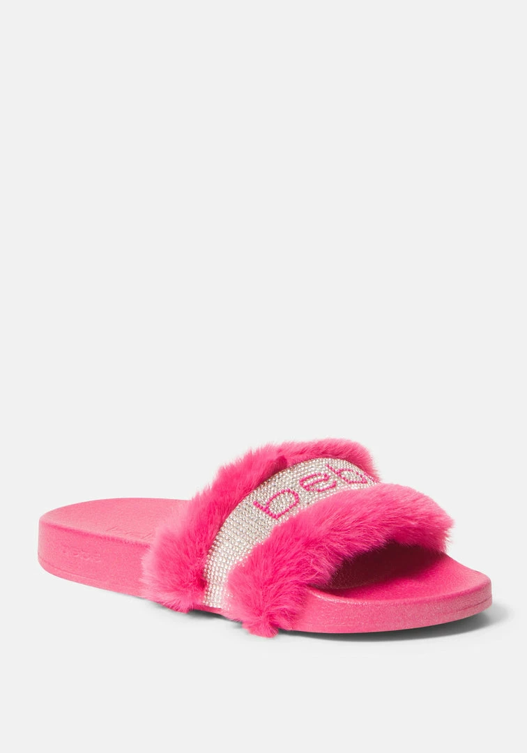 Our latest slides feature a fluffy faux fur exterior, an embellished rhinestone logo on top, and a molded footbed. Perfect for a comfy statement while lounging at home