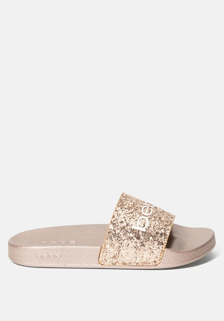 Totally glam, these wedge slides flaunt a glitter vamp accented by a Bebe logo. Feature a comfy footbed.