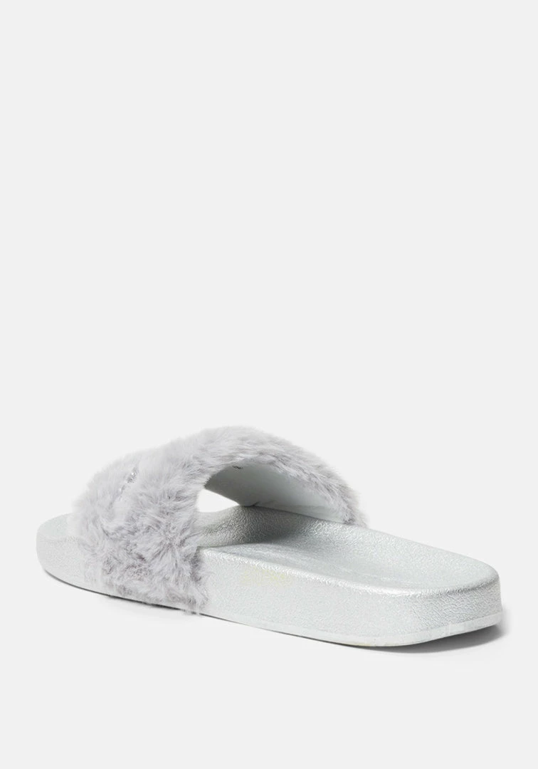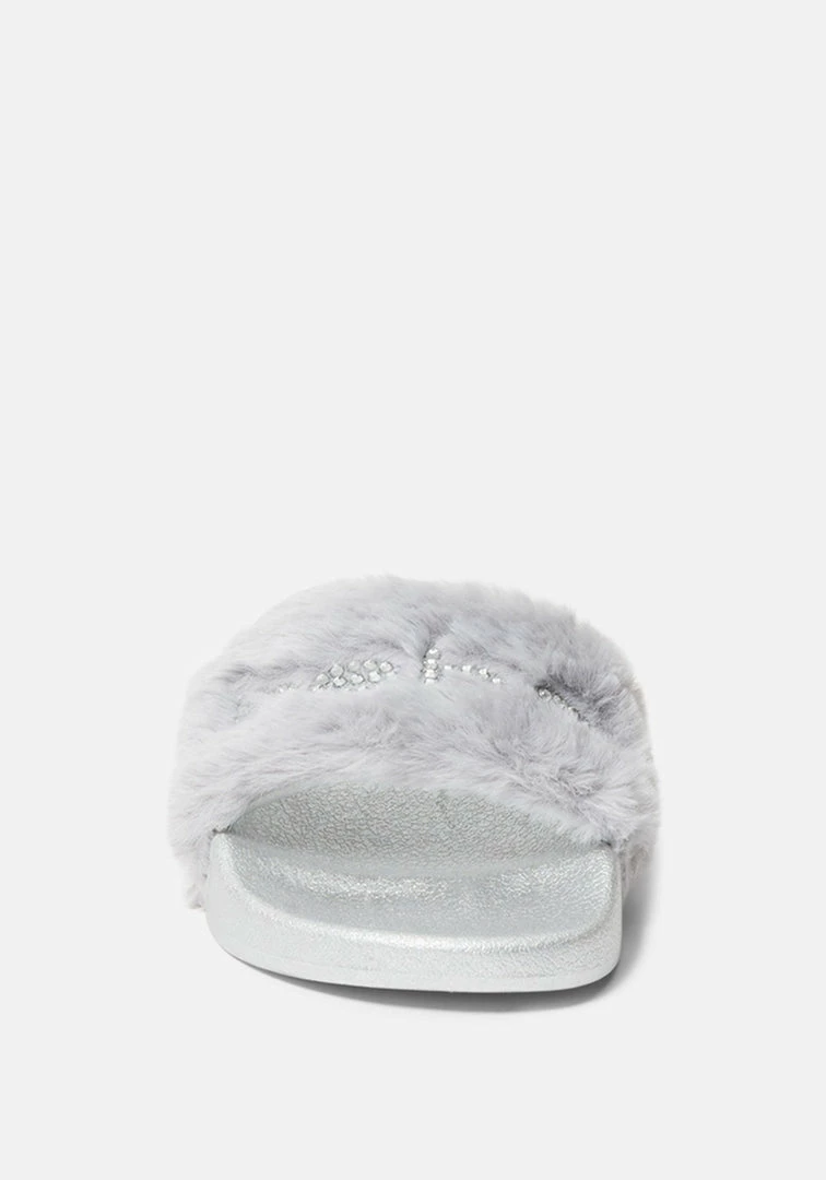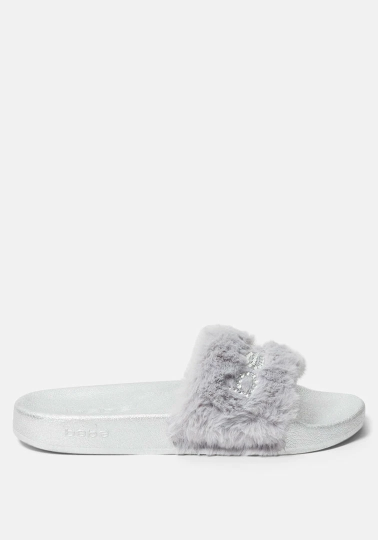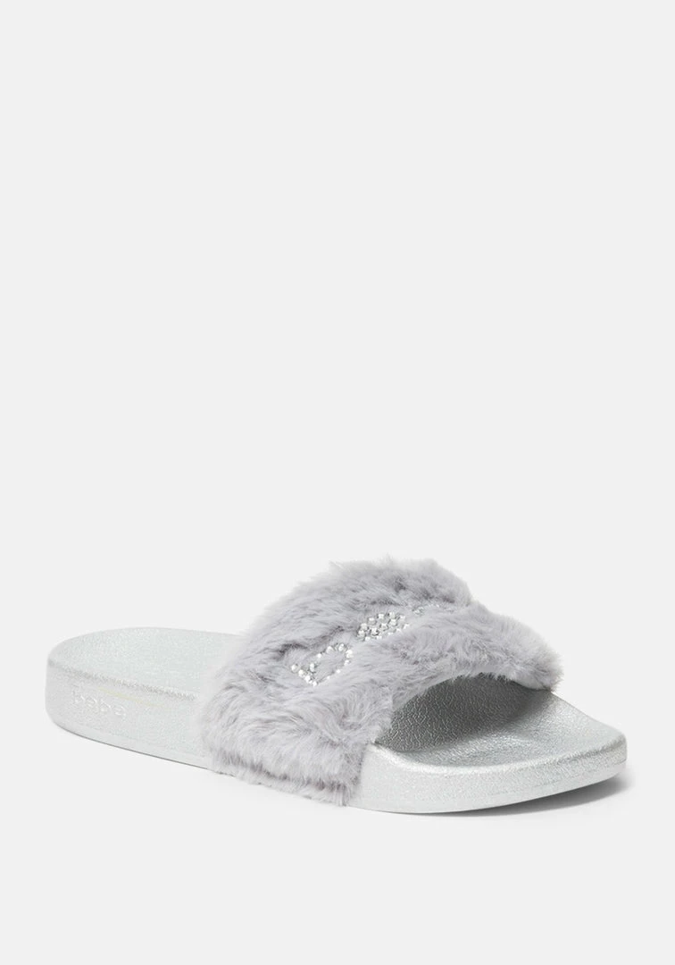 Fun and fashionable, these slides feature a glitzy logo and fuzzy strap.