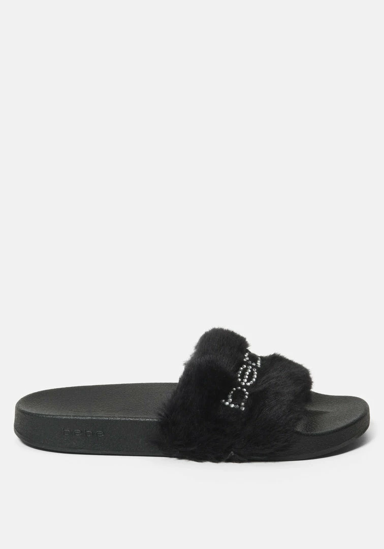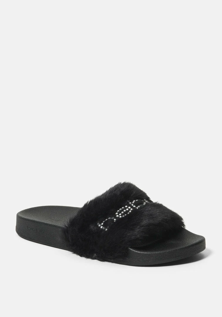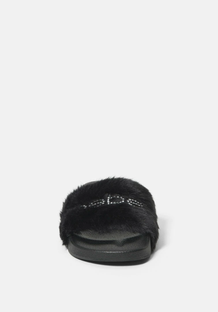 Fun and fashionable, these slides feature a glitzy logo and fuzzy strap.