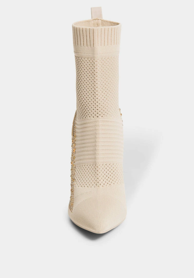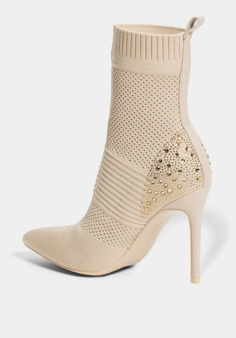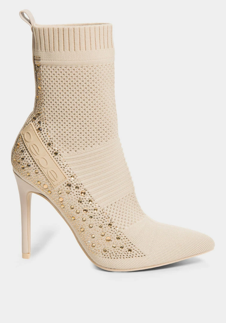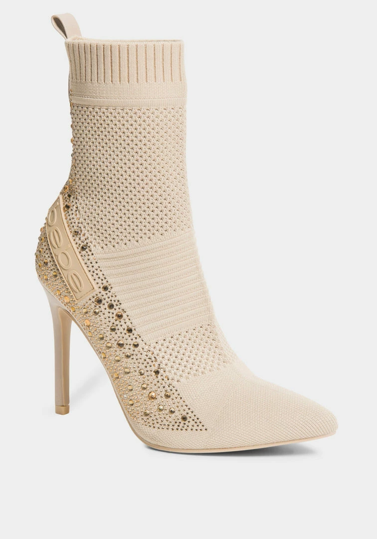 These perfect booties feature fly knit ribbed texture and delicate rhinestones for a pop of glam with a pointed toe and stiletto heel.