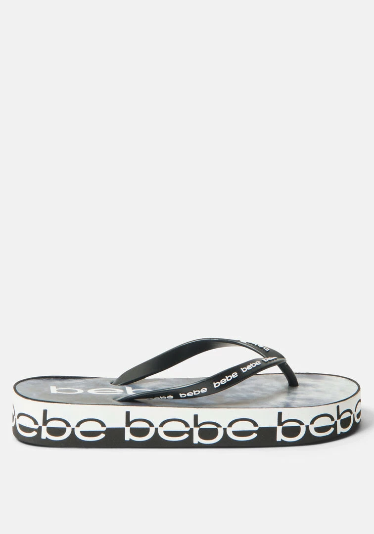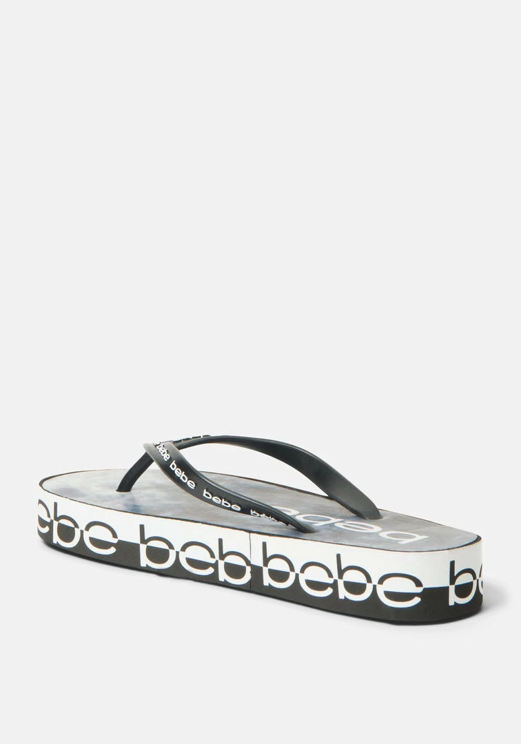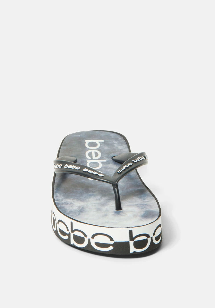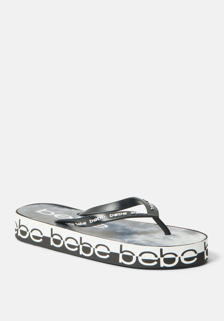 These platform flip-flops lifted by a cushioned platform feature an all-around Bebe logo. Perfect for lounging or brunching.