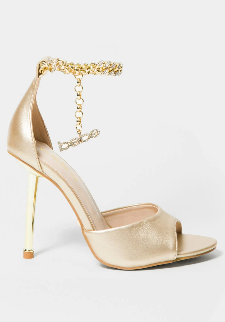 Turn heads in this sexy 2-piece sandal with a thin sleek stiletto heel and bebe logo ankle chain.