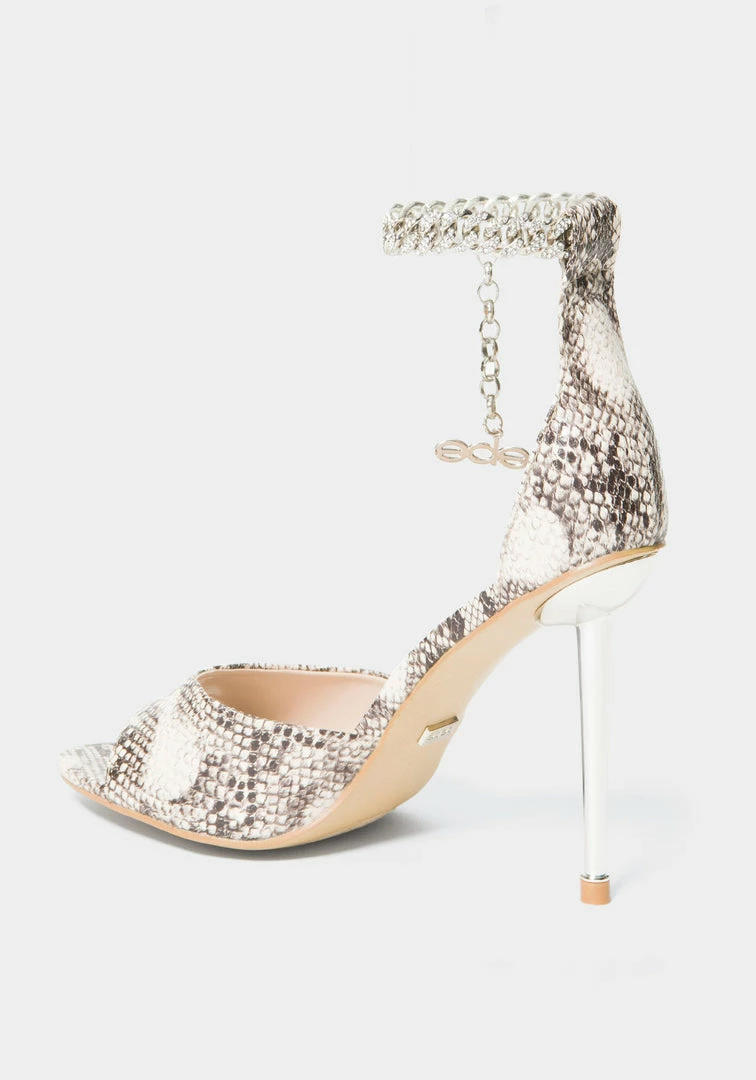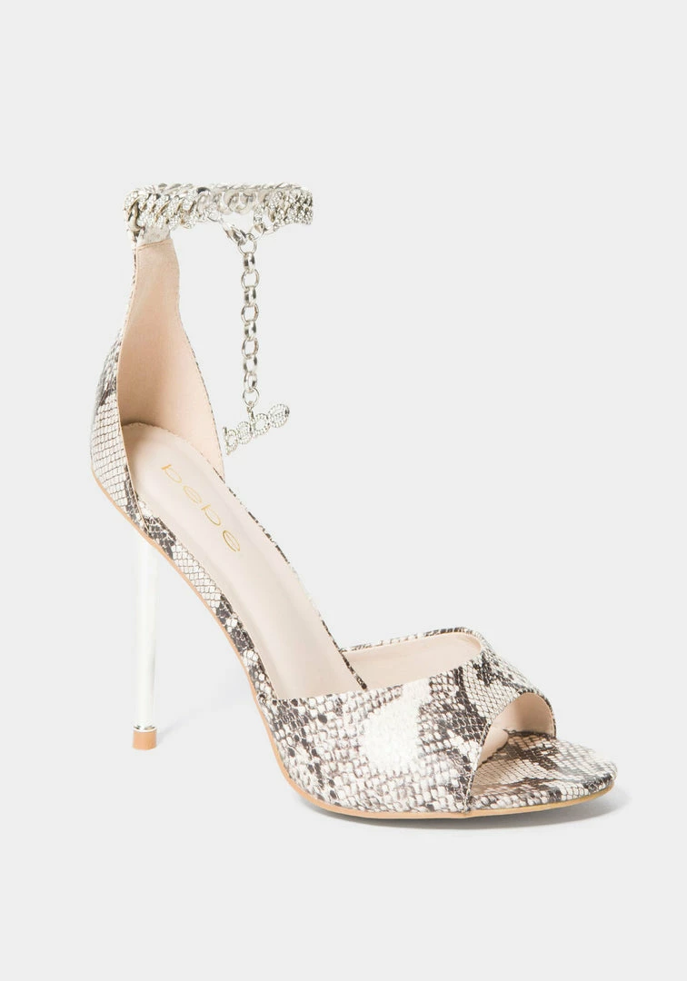Turn heads in this sexy 2-piece sandal with a thin sleek stiletto heel and bebe logo ankle chain.