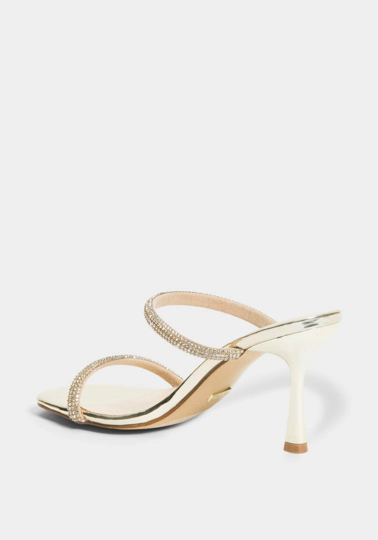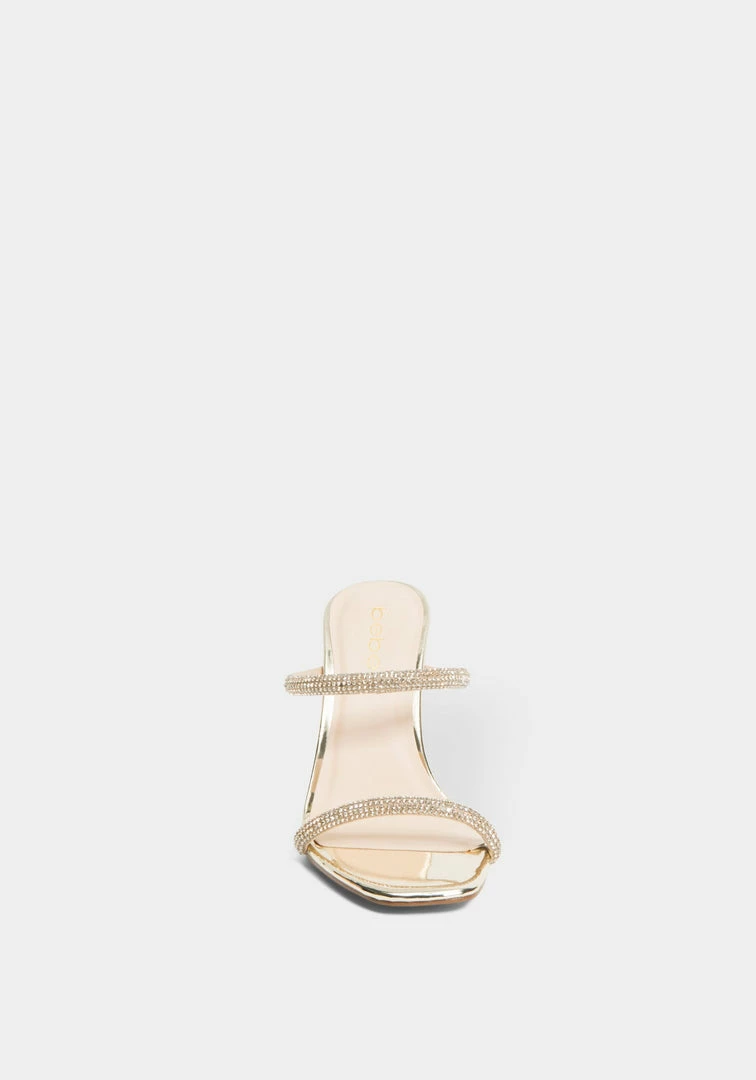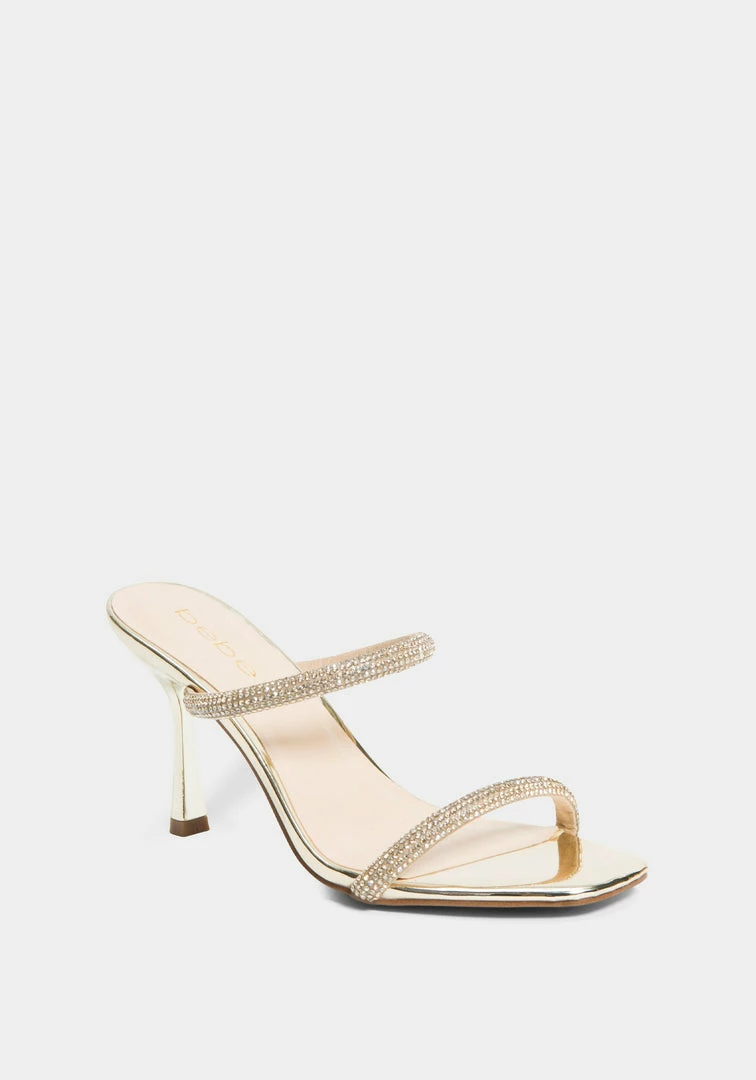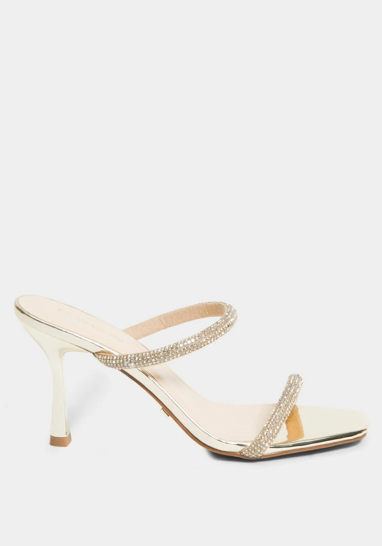 A strappy sandal features a stiletto heel and front straps with a rhinestone-studded design.