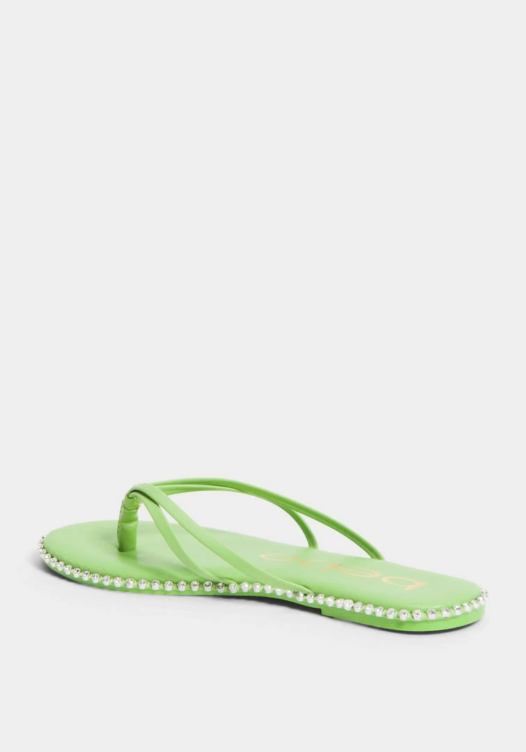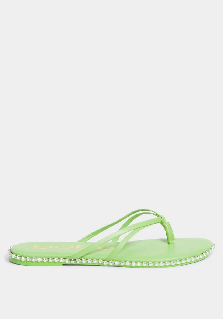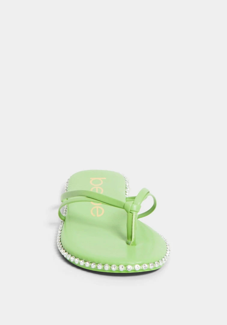 A low thong sandal features a studded design along the sole for a glamorous touch.