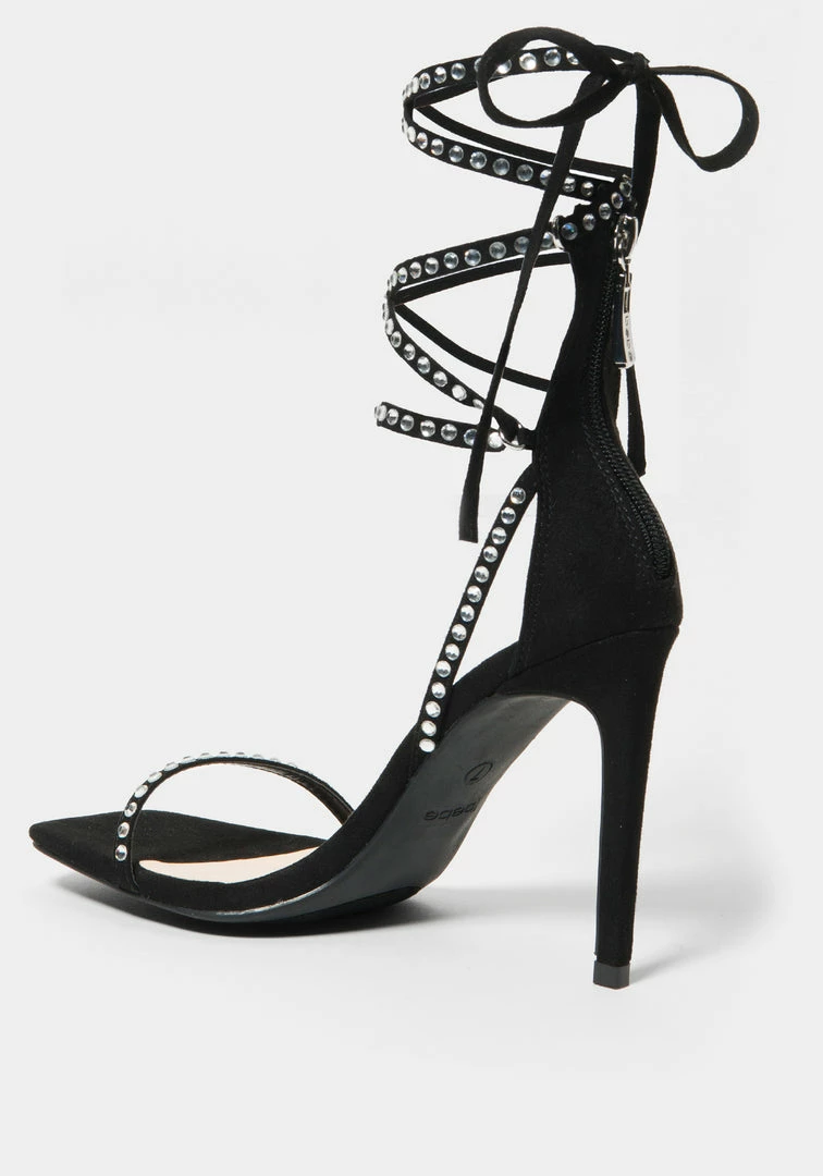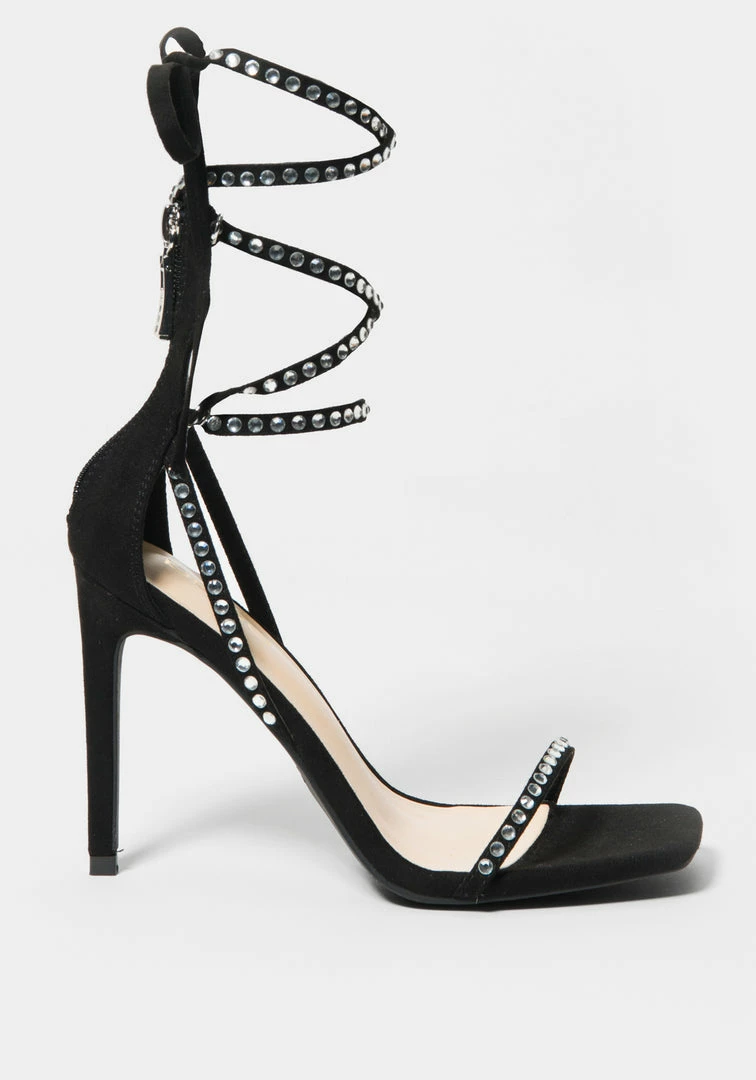 A sleek evening sandal features glitter rhinestone-studded straps and a stiletto heel.