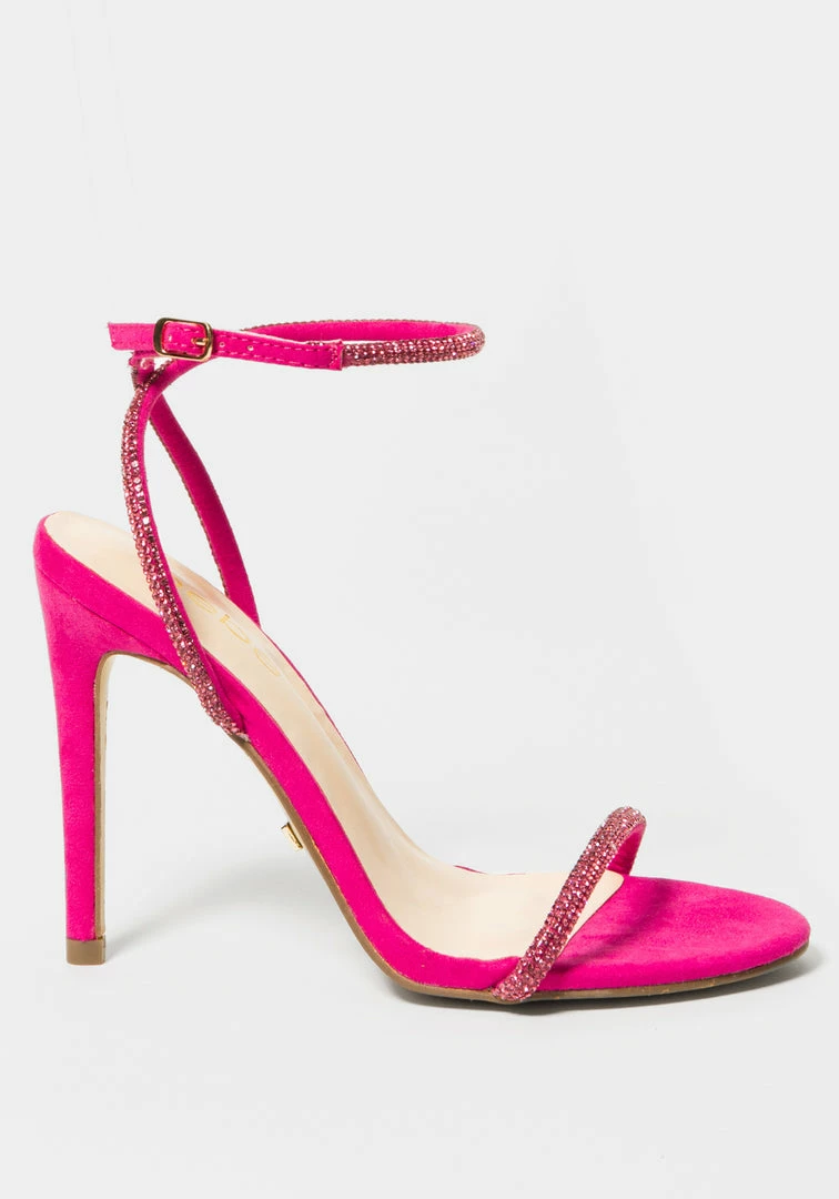 A sleek evening sandal features glitter rhinestone-studded straps and a stiletto heel.