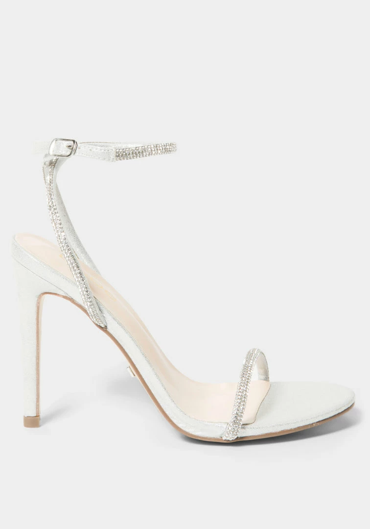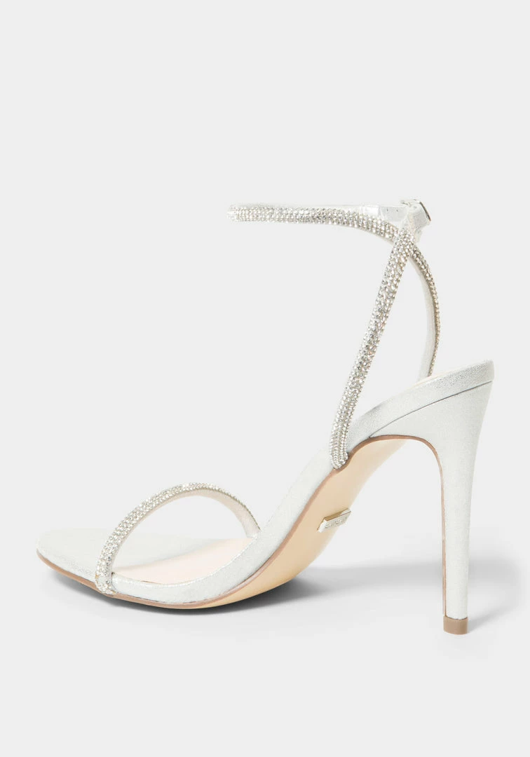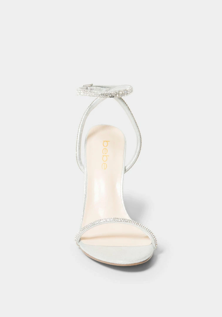 A sleek evening sandal features glitter rhinestone-studded straps and a stiletto heel.
