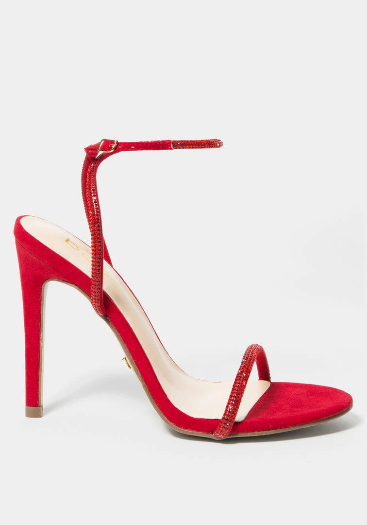 A sleek evening sandal features glitter rhinestone-studded straps and a stiletto heel.